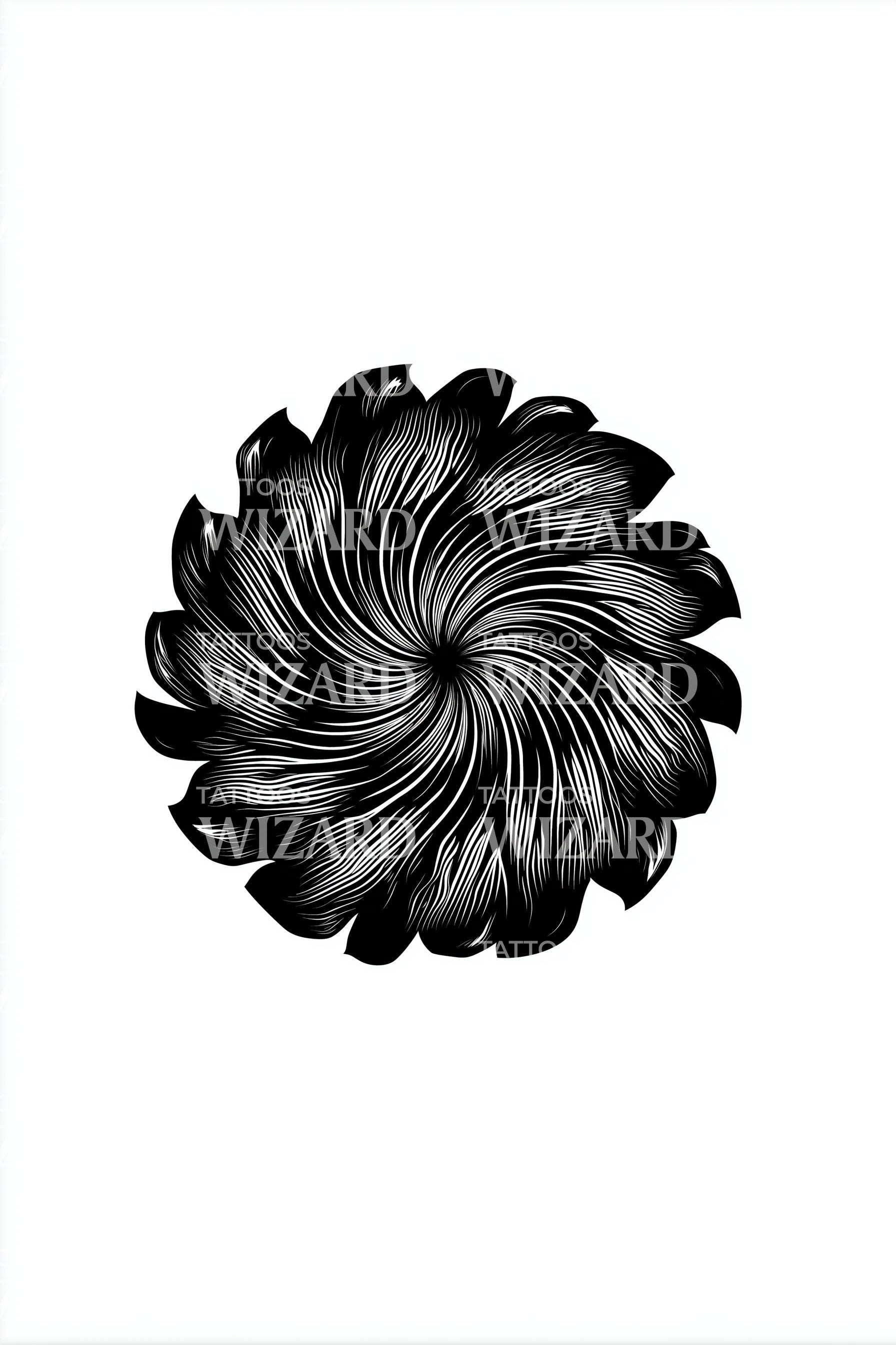Släpp loss din unika stil med denna fängslande geometriska tatueringsdesign. Intrikat utformad spiralar designen in i en blommandala, som förenar blackwork med optiska illusioner. Det är inte bara en tatuering, det är ett konstverk som sveper din hud i en gåtfull, blomstrande skönhet.