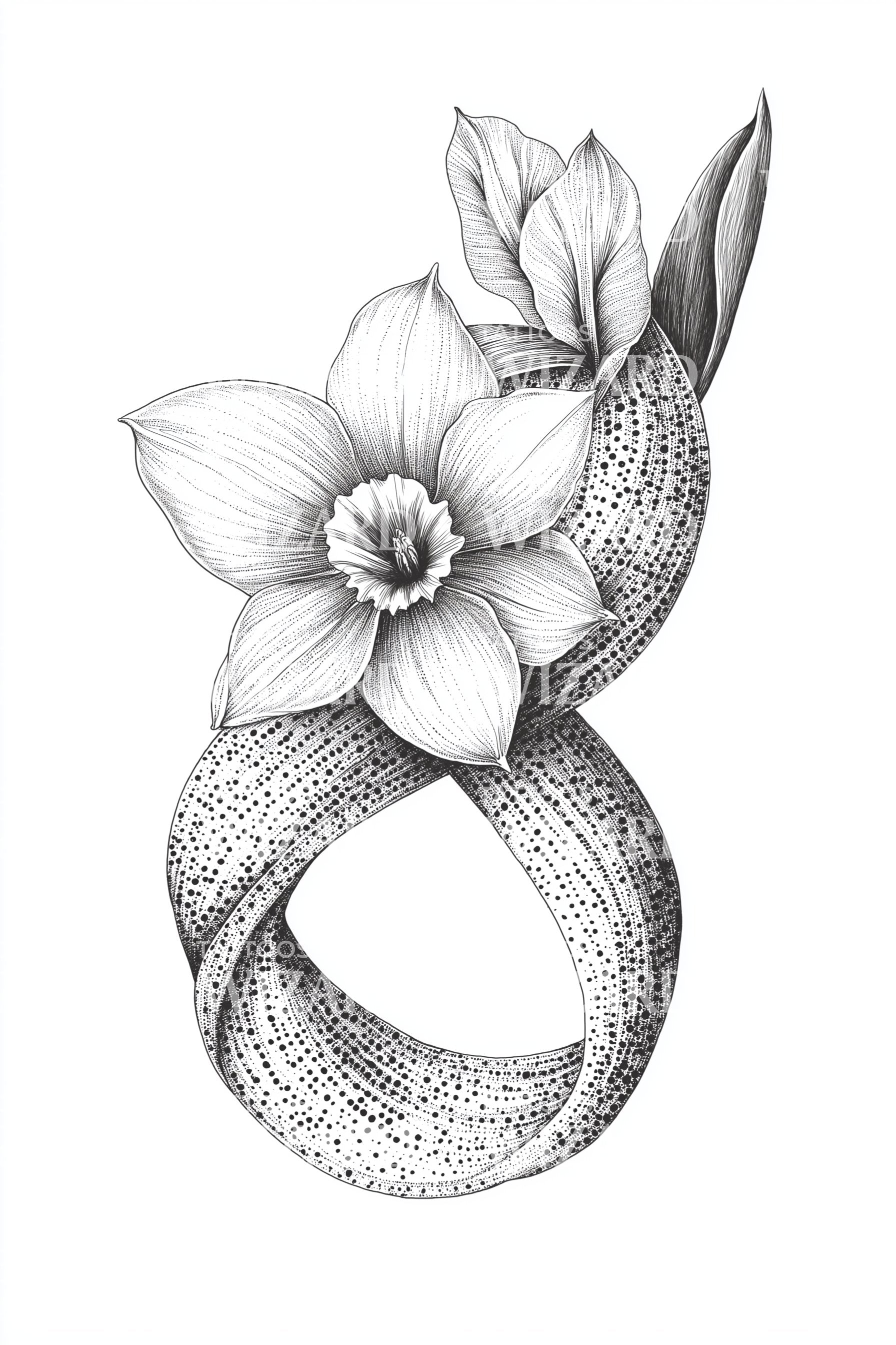 Omfamna grace och natur med denna fängslande illustrativa tatueringsdesign. Med ett ömt blomster som omsluts av en vackert intrikat ring, omsluter designen naturligt vilken del av din kropp som helst. Det är en fängslande blandning av blomsterprakt, som presenterar en bestående symbol för elegans och motståndskraft.