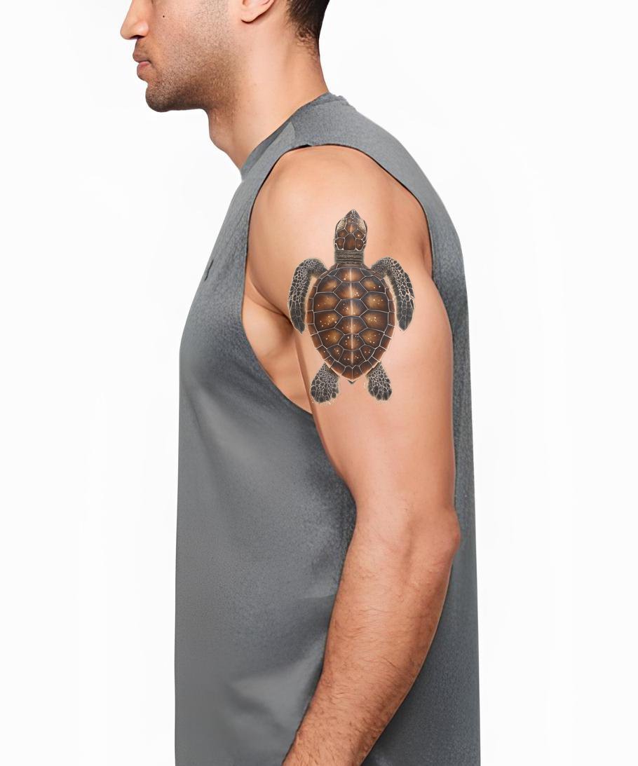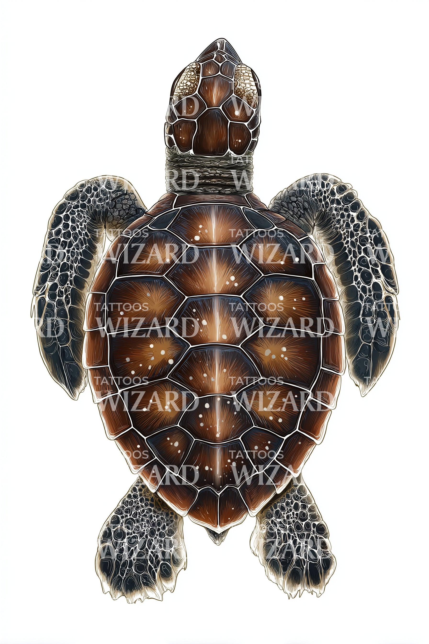 Dyk in i naturens skönhet med denna realistiska tatueringsdesign. Den visar en utsökt detaljerad sköldpadda som förkroppsligar den lugna andan hos marint djurliv. Från dess intrikata skal till den livfulla havsbotten fångar denna design perfekt den majestätiska dragningskraften hos undervattensfaunan.
