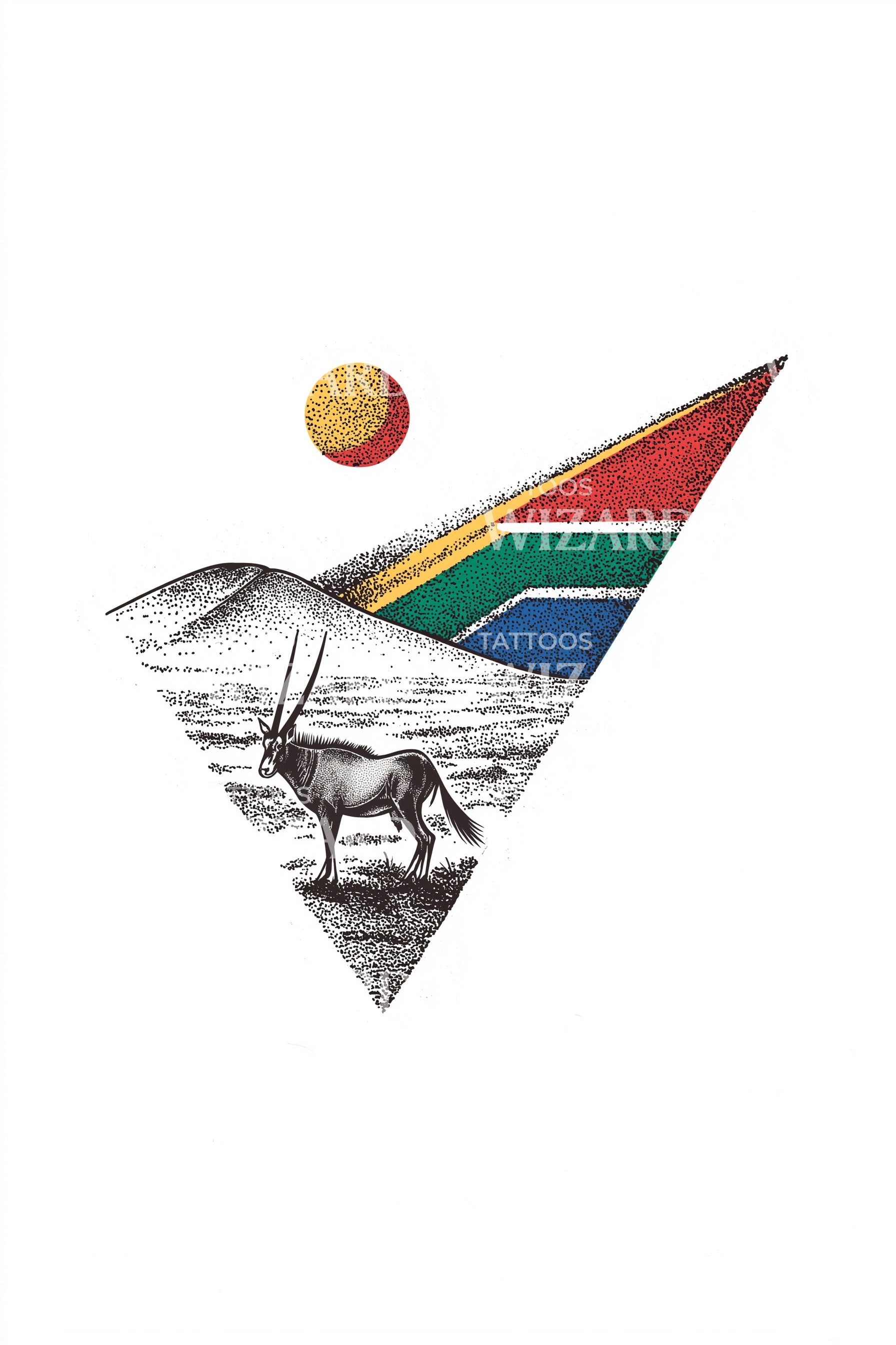 Fira Sydafrikas anda med ett geometriskt triangellandskap. Skarpa bergssiluetter reser sig inom korsande linjer, medan subtila accenter speglar den sydafrikanska flaggans livfulla palett. Minimalistisk men djärv, denna design balanserar symmetri och reslust—perfekt för resenärer, naturälskare och alla som hedrar sina rötter genom modern, ren tatueringskonst.