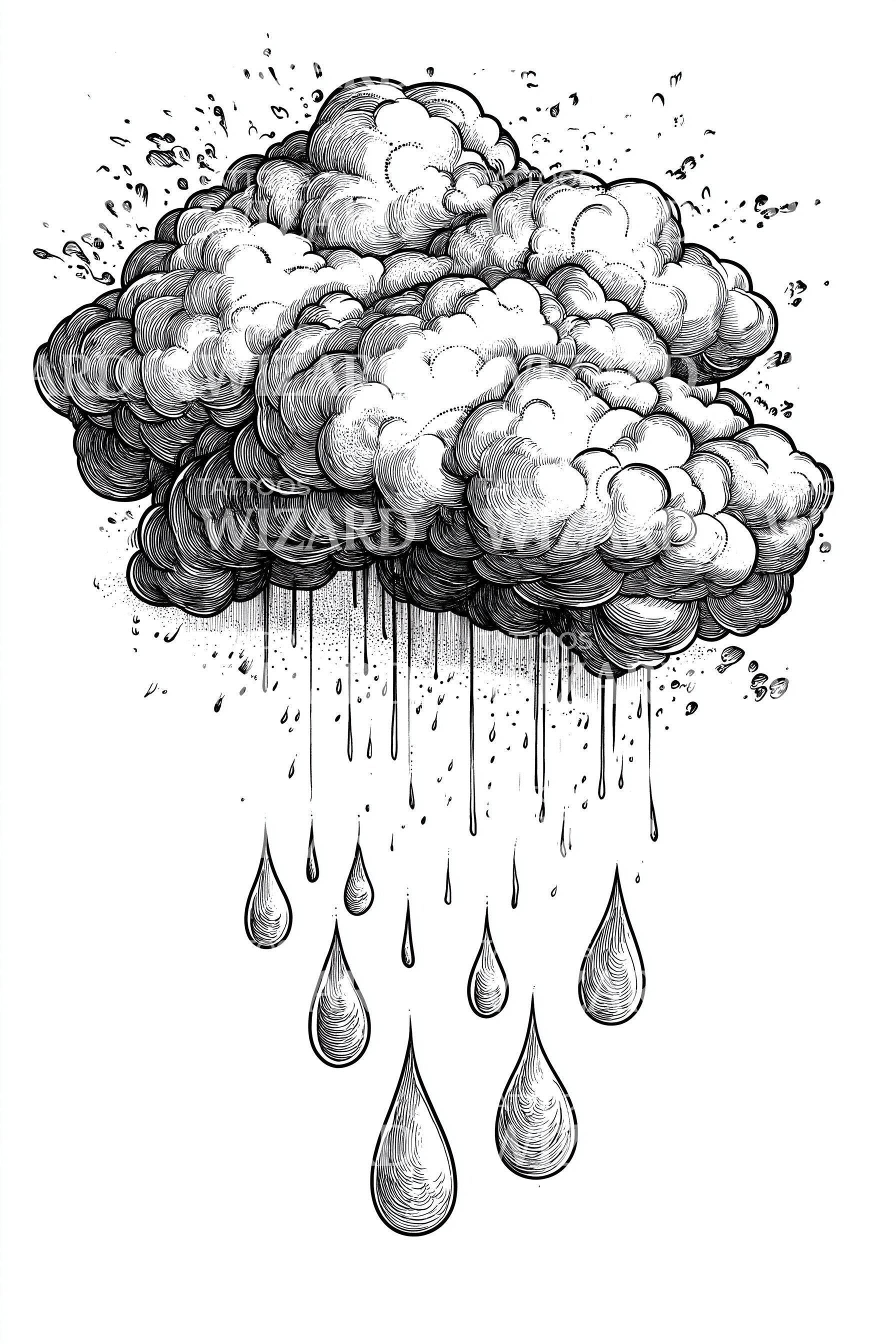 Gathered cloudwork in black&grey billows with etched texture, releasing long inked drips into heavy raindrops. A small storm carried on skin, it honors weathered moods and cleansing release. Symbol of resilience after dark skies, the piece centers calm, grounding the wearer with quiet, rain-born resolve and clarity within.