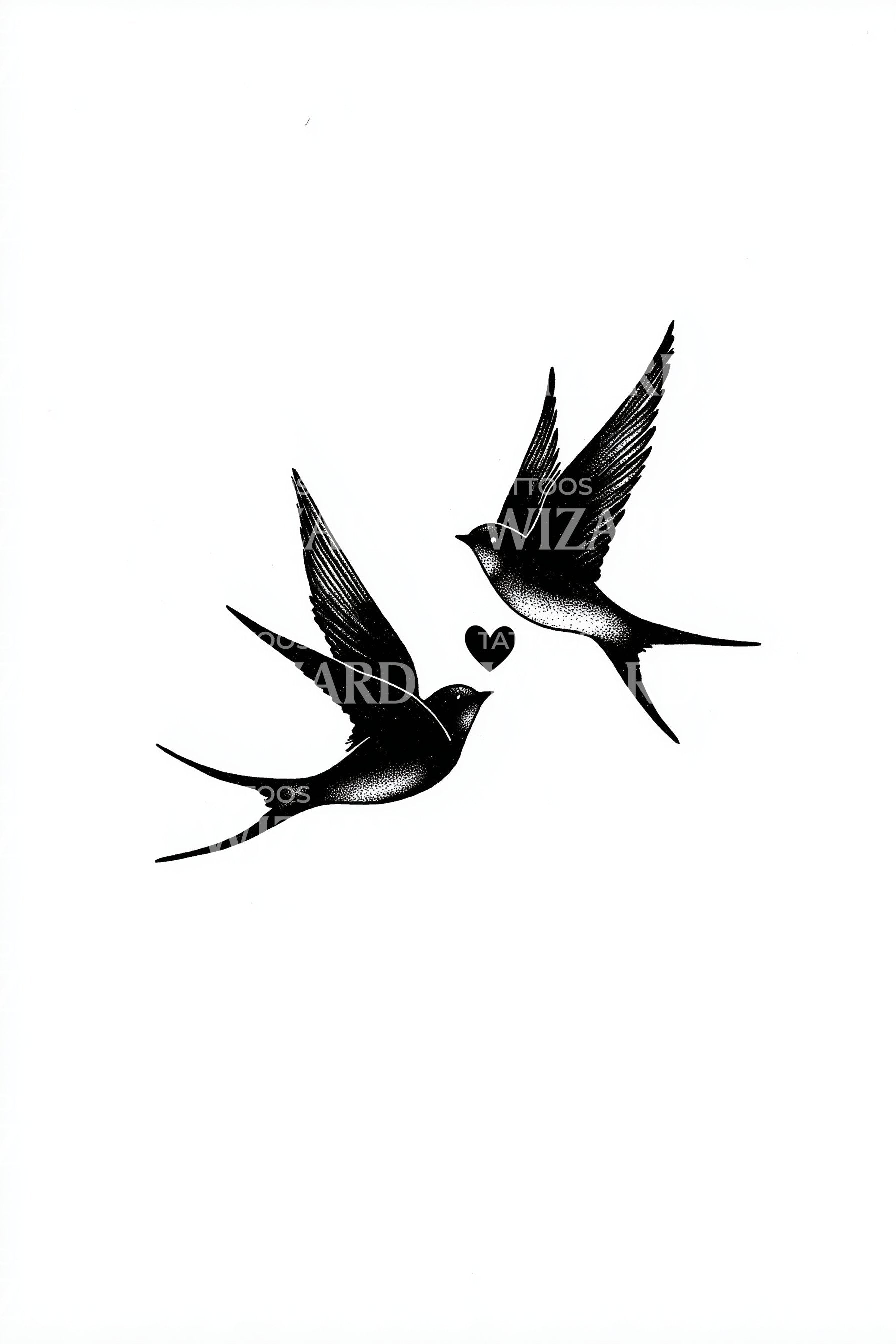 Oldschool swallows arc across clean skin, bold black with soft dot shading, tails flicked like anchors, a tiny heart between their beaks. A sailor's vow to home and freedom, a pair forever in flight. Wearing it feels like wind in the chest, skywide courage, love as compass.
