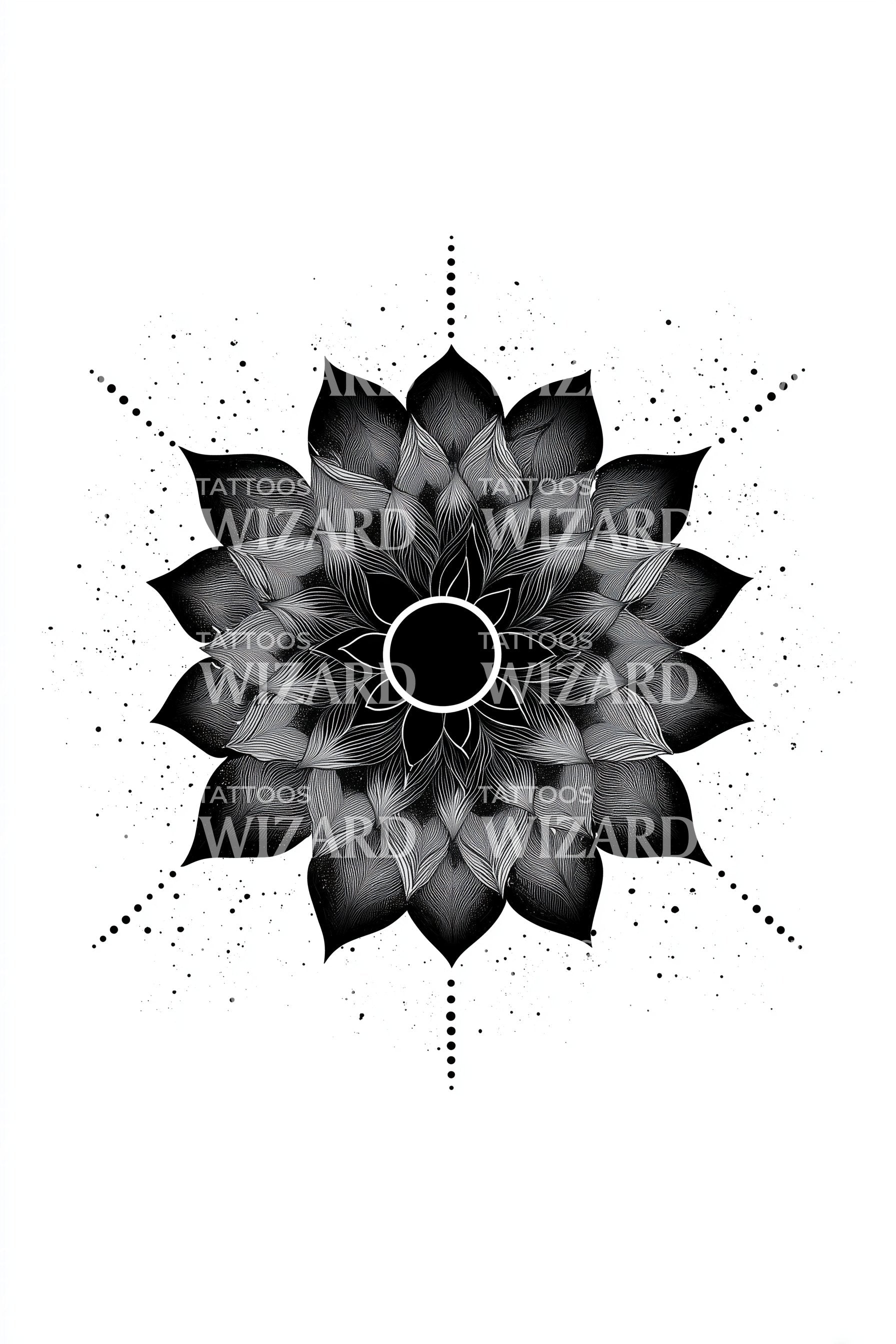 Radiant blackwork mandala blooms in layered petals, fine linework and soft dotwork, orbiting a bold midnight core. Sacred geometry maps balance and rebirth; each petal marks growth, the dark center a calm, infinite self. Wearing it feels grounding and luminous, like carrying a private temple of steady light.