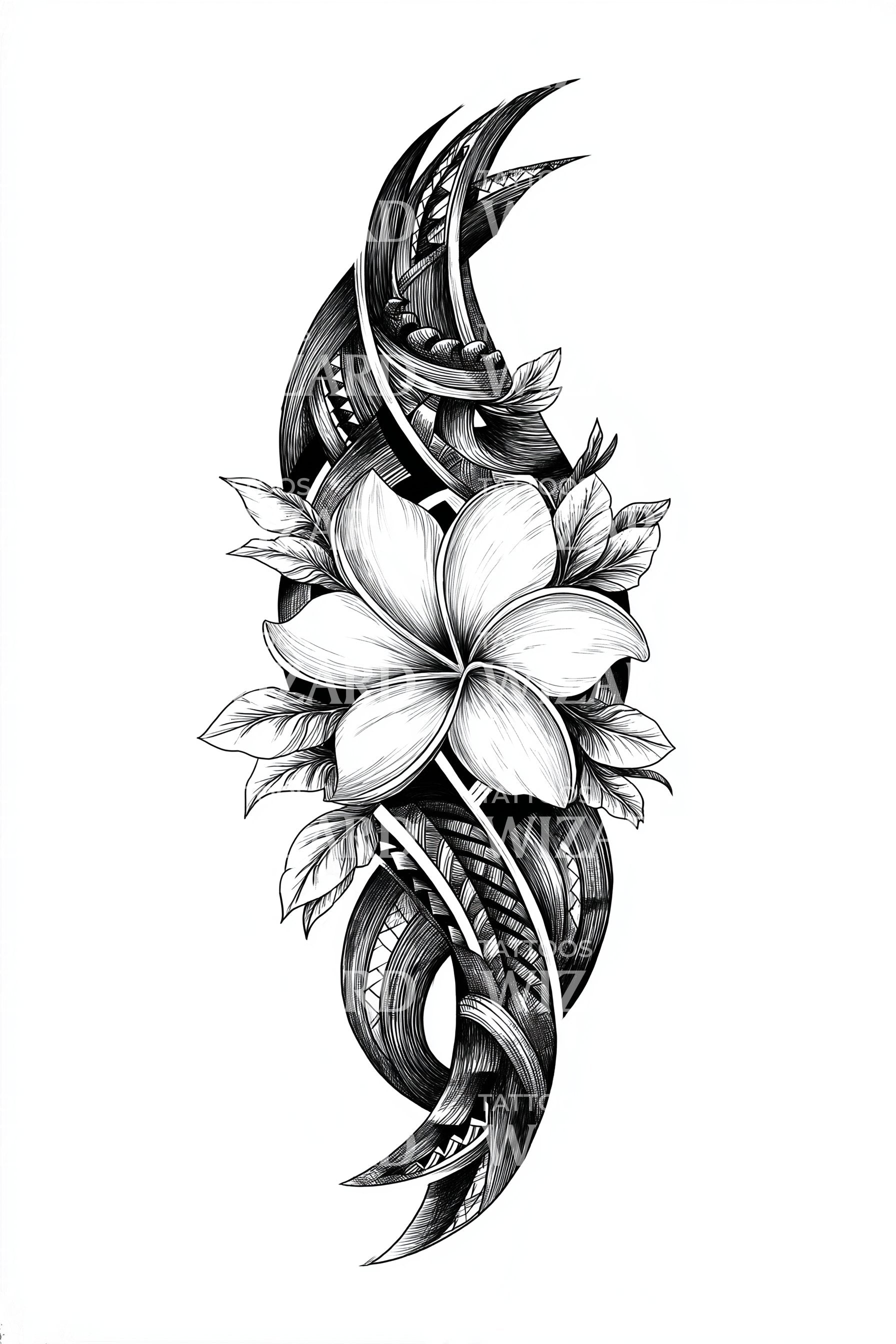 Plumeria çiçekleri ve yaprak unsurlarını vurgulayan bu kabile dövme tasarımıyla benzersiz tarzınızı ortaya çıkarın. Çiçek ve kabile sanatının birleşimi, büyüleyici bir dönme ve akış deseni yaratır. Bu tasarım, dayanıklılığa odaklanarak dirençli ruhunuzu güzelce yansıtır. Kabile estetiğinin çiçeksi dokunuşla mükemmel bir birleşimi!
