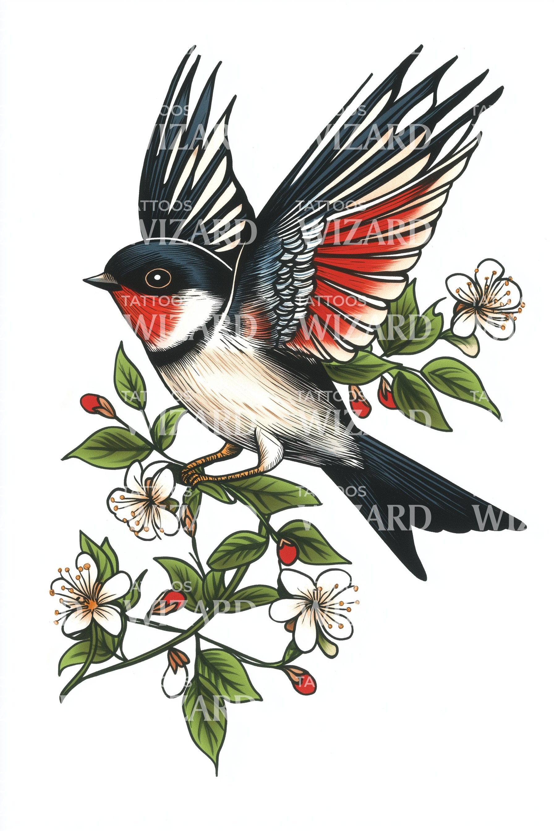 Kırlangıç ve Yasemin Çiçekleri Dövme İllüstrasyonu