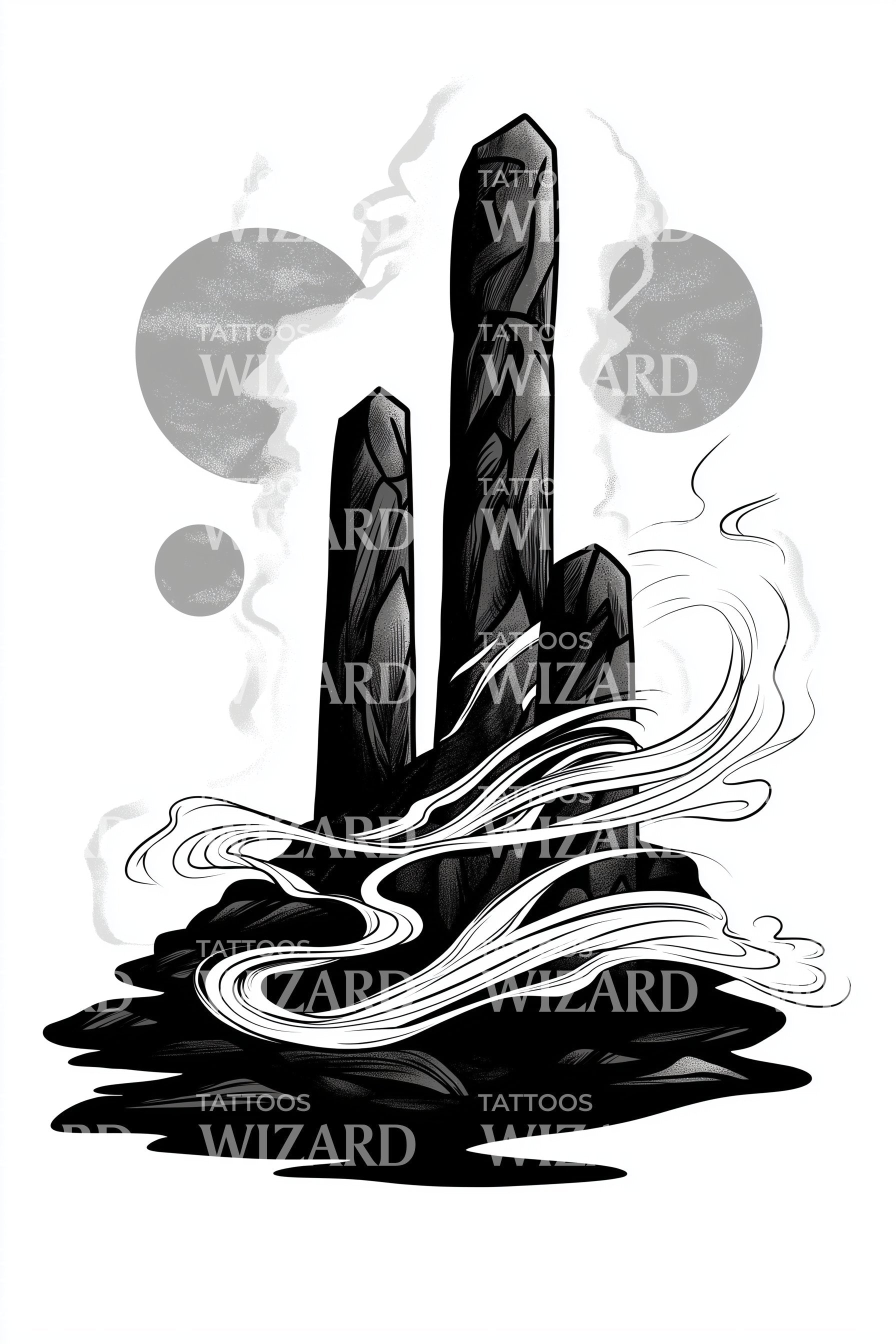 Obsidian spires rise like carved monoliths, blackwork planes etched with grain, circled by moons and silk-smoke ribbons over a pooled shadow. This abstract altar speaks of resilience, initiation, and threshold-crossing. Wearing it feels grounded yet mystic, a quiet storm of strength, clarity, unshakable presence, and endurance within always.