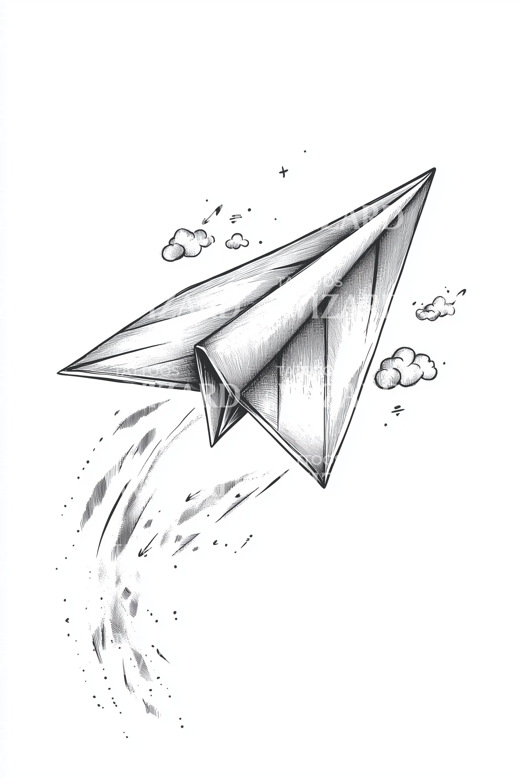 Sketch-born origami plane, graphite shading, gusts and motion swoops. A paper flight of ideas, youthful daring, and destinations made from simple folds. Wears like permission to launch, playful yet determined. Ideal on forearm for glide, along ribs for sweeping arc, calf for upward climb, collarbone for featherlight lift.