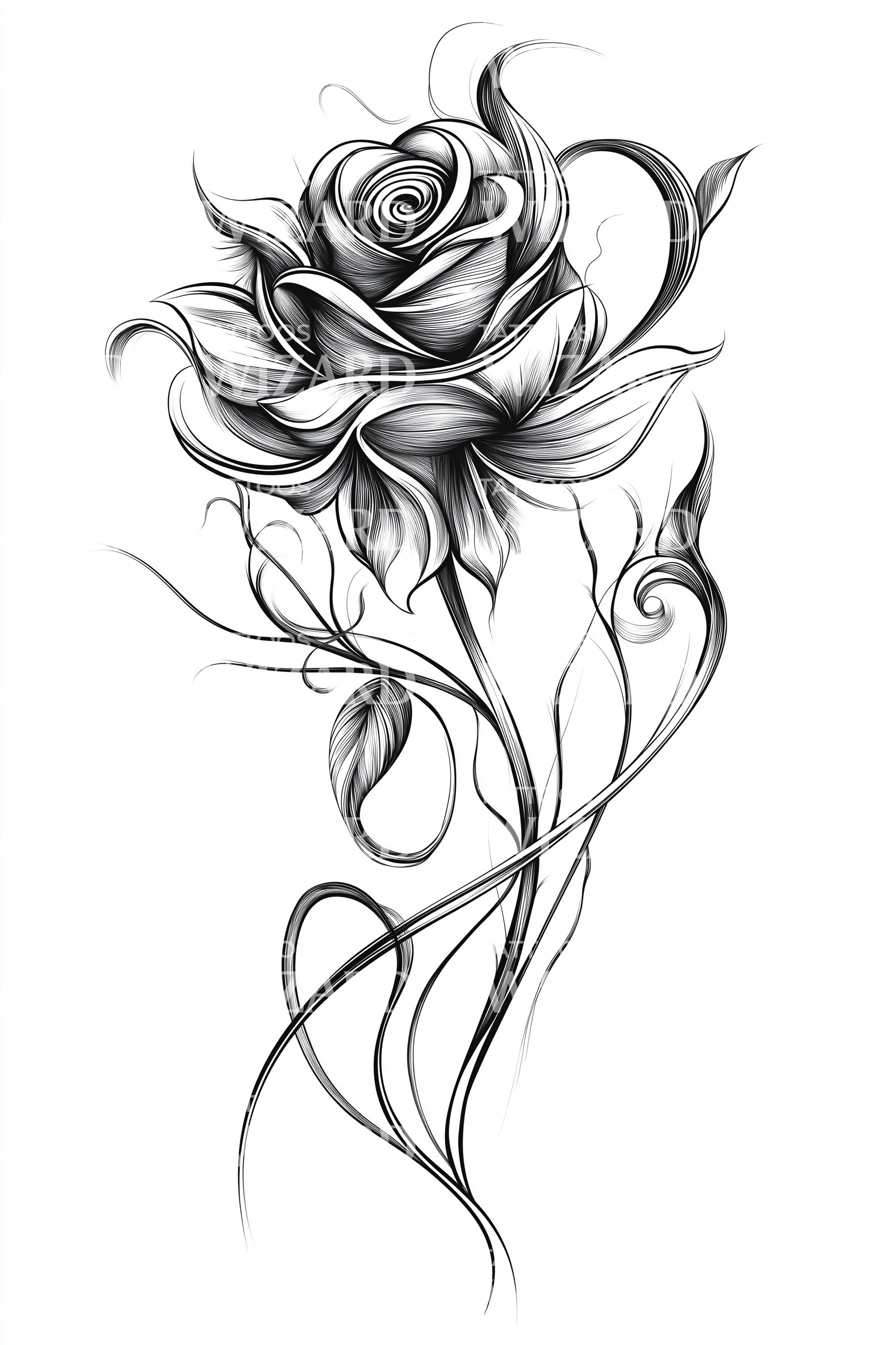 Vintage black sketch rose unfurls in feathered petals and whisper-thin thorns, all fluid linework and airy shading. Symbolizes love tempered by resilience, beauty that remembers its roots. Wears like quiet armor and a poem. Ideal placements: forearm, ribs, spine, or calf, where its vertical flow elongates and moves.