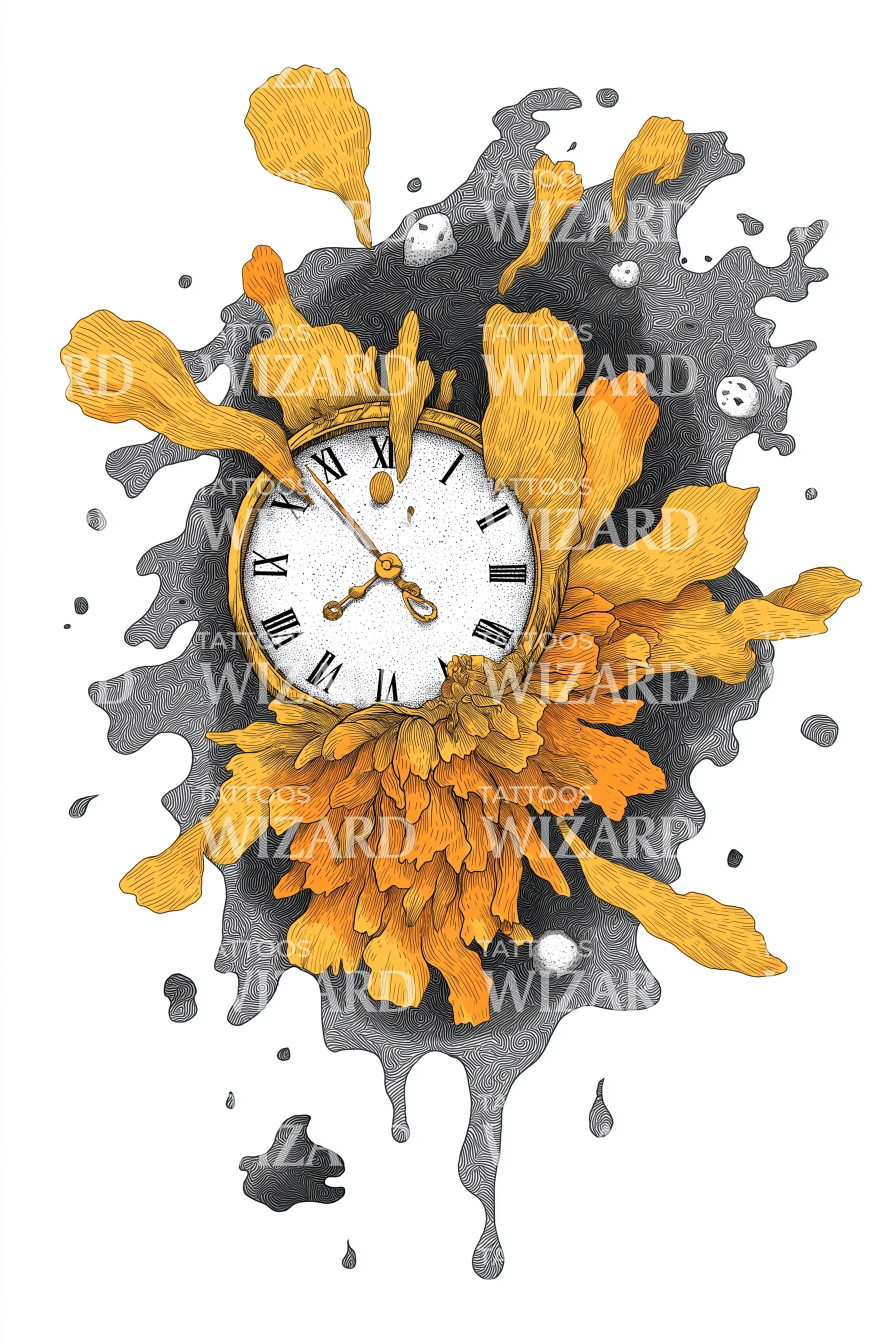 Bu yenilikçi dövme tasarımıyla alışılmışın dışındaki yanınızı ortaya çıkarın. Canlı kadife çiçeği tonlarındaki sıçrayan boya, soyut bir desenle stilize edilerek geçici zamanı simgeleyen karmaşık saatin önünde muhteşem bir arka plan yaratıyor. Yaratıcılık ve yorumun sanatsal bir birleşimi olan bu parça, soyut zamanın hikayesini anlatıyor.