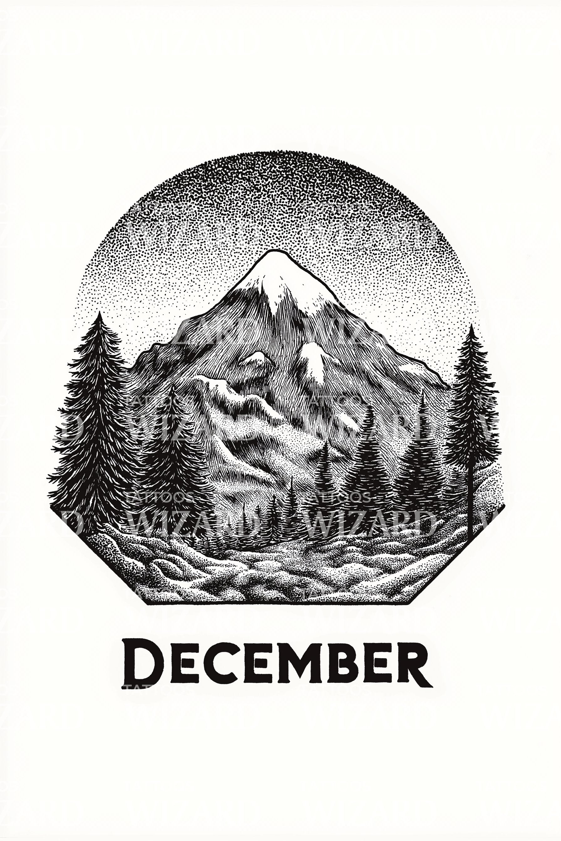 Blackwork circle frames an alpine landscape of peak, stippled sky, and pines, crisp as frost. December crowns the scene like a vow. The mountain signifies endurance, the forest resilience, the sky renewal. Wearing it feels like winter breath in the lungs, clear, steady, guiding you to higher ground.