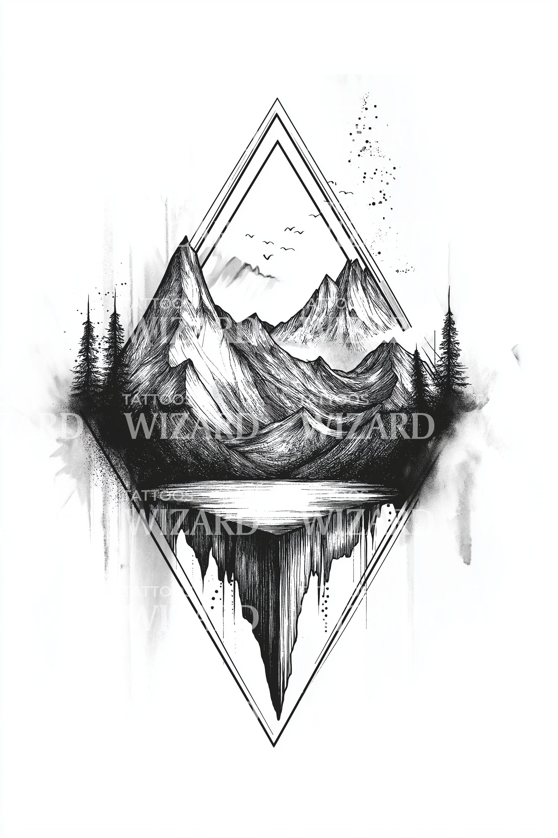 沉浸于这款黑灰色纹身设计中大自然的迷人之美。山脉与森林这对引人注目的组合成为焦点,精心镶嵌在独特的几何三角形内。作为对风景宁静的颂歌,这件作品是任何自然爱好者的理想之选。
