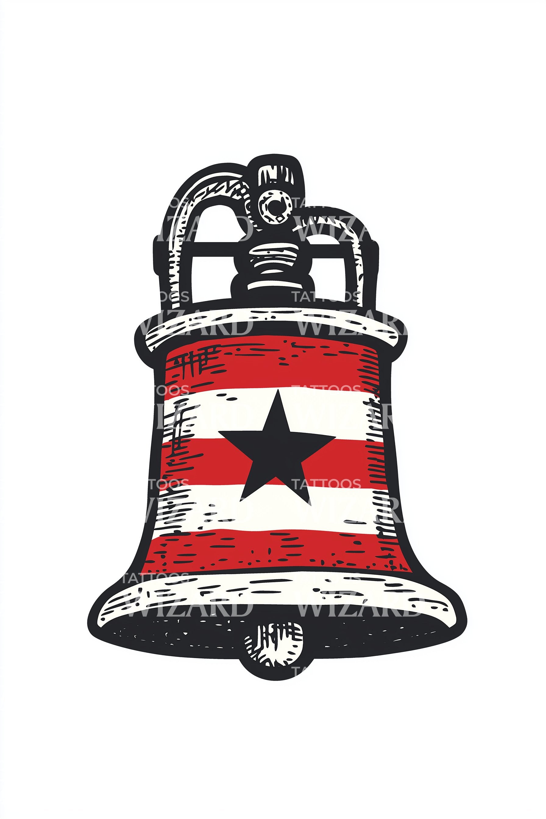 用这款复古纹身庆祝永恒的自豪感:一枚大胆的铃铛,两侧点缀着星星和复古条纹,呼应经典的美式闪图。粗犷的线条、饱和的红蓝色彩和风化的阴影,致敬传统与坚韧——完美适合爱国者、传统主义者和正宗美式纹身收藏者。设计随时间自然老化。