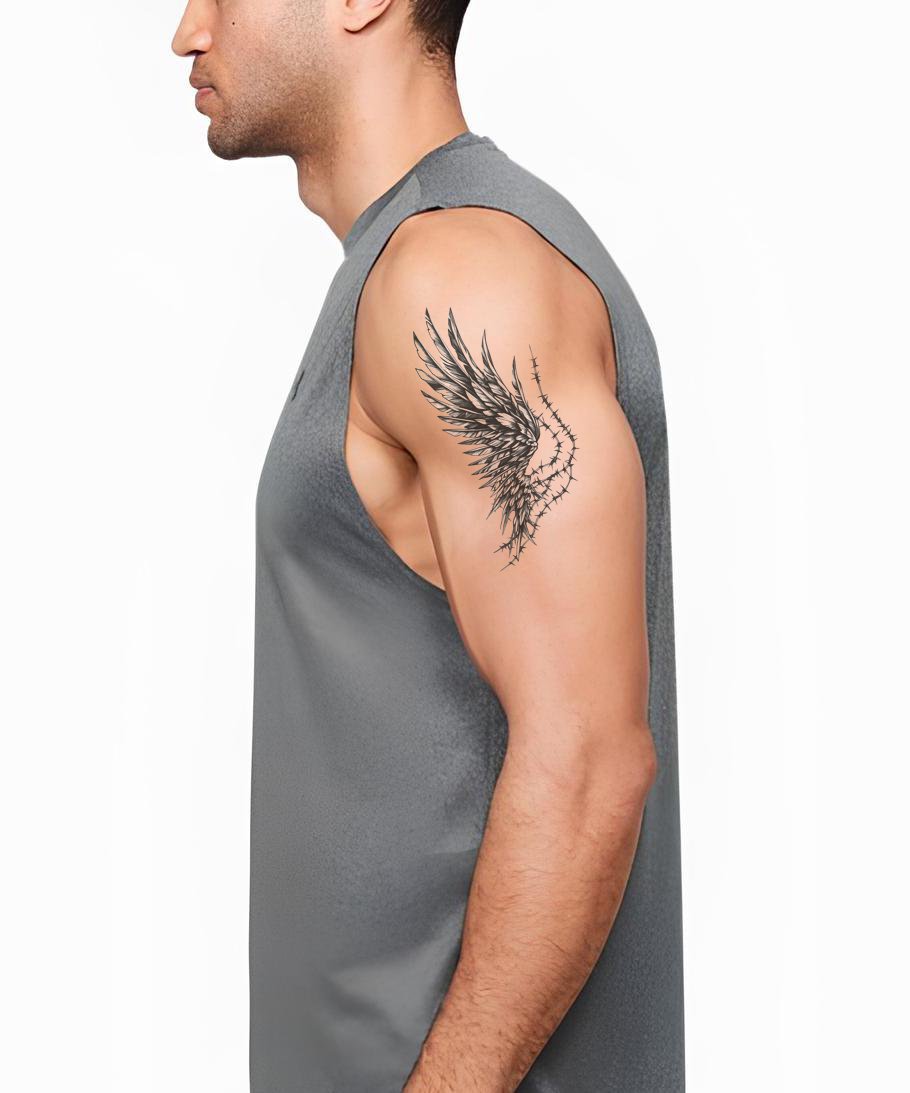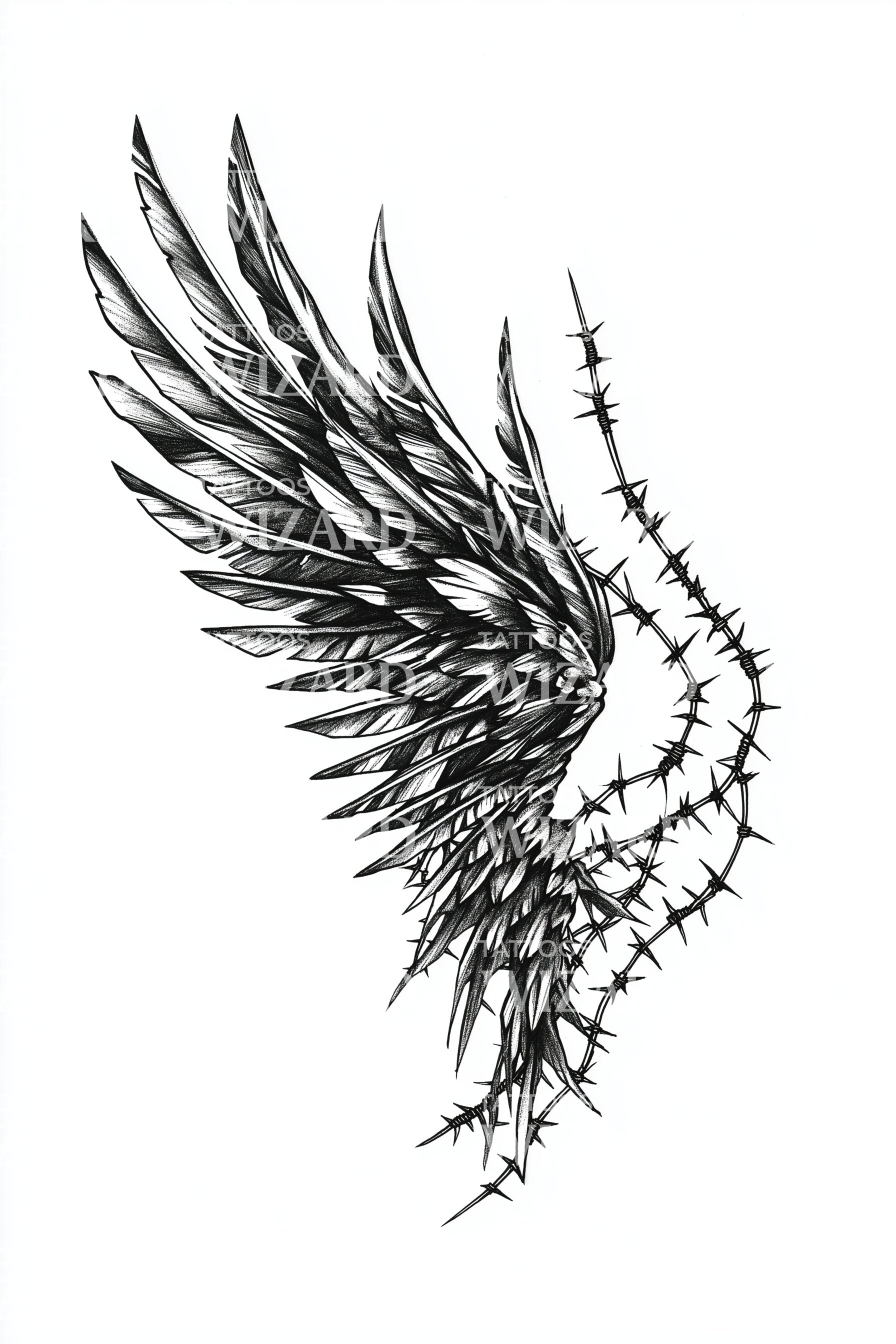 Razor-feathered blackwork wing arcs upward, each shard of plumage edged in shadow, trailed by curling barbed wire. A fallen angel’s moment of rupture becomes scripture on skin: shattered grace refusing surrender. Worn, it feels fierce and cleansing, a deliberate rebirth that turns scars into flight, again and again.