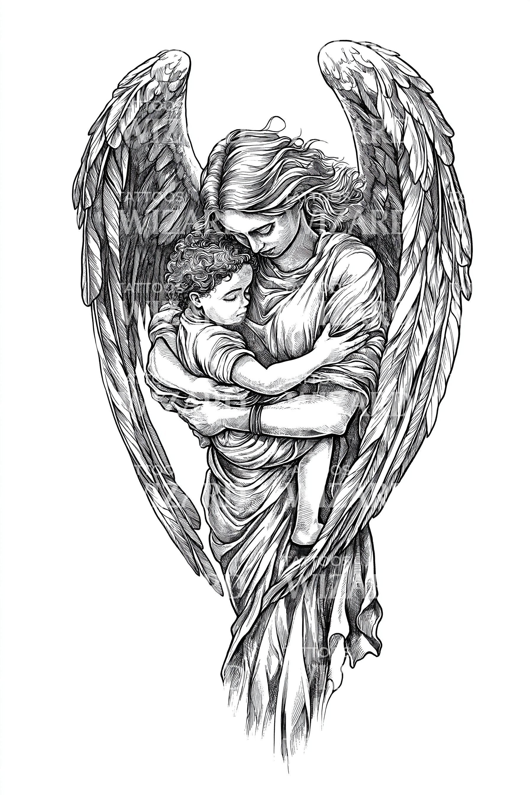 这款黑灰色纹身设计散发出神圣的保护与安慰。展现了一位天使温柔拥抱的画面,完美象征着信仰与天界守护。单色调的配色提升了其优雅感,使其成为精神力量与神圣之爱的理想象征。