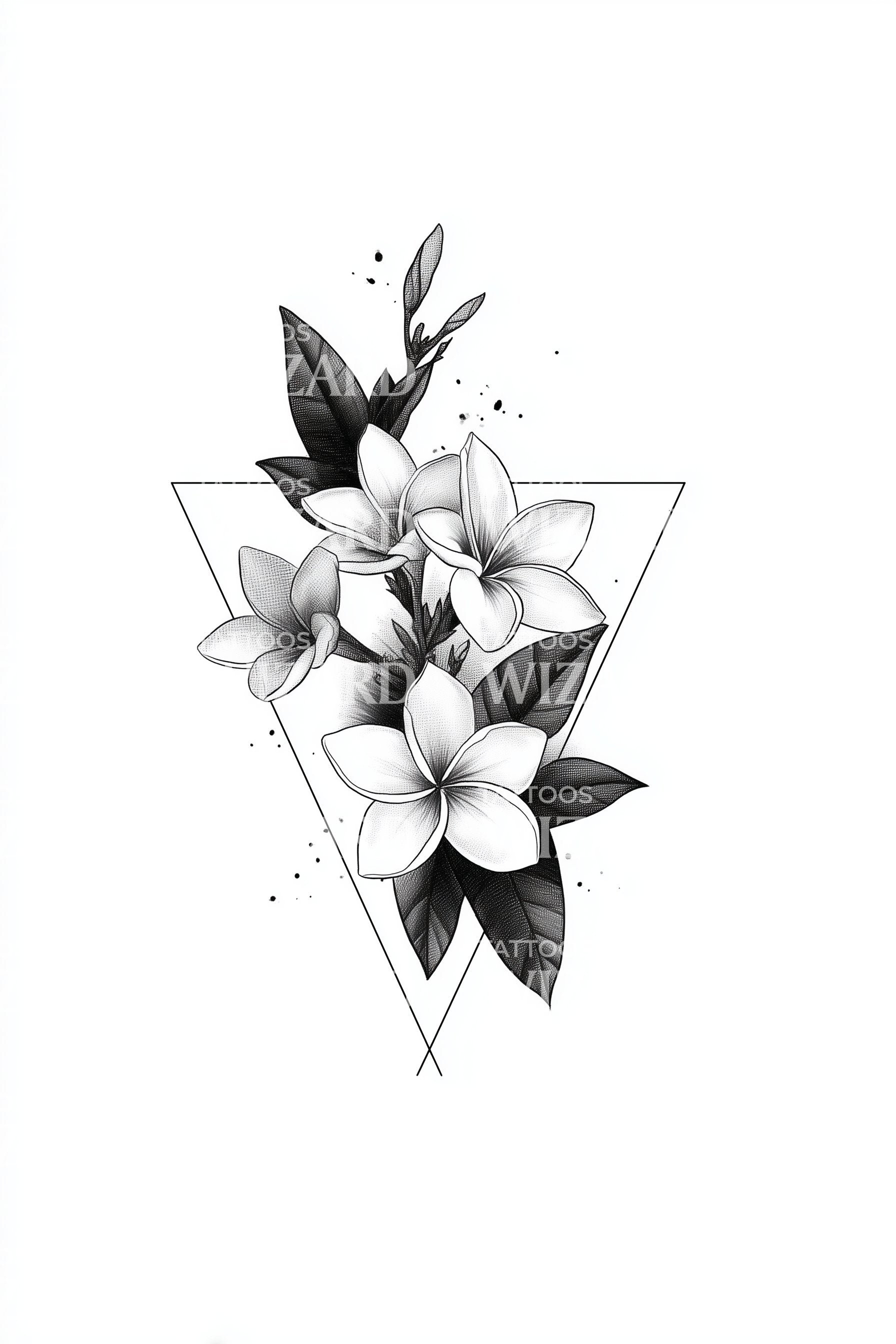 用这款几何纹身设计为您的个人风格增添锋芒。以锐利的三角形组合成一束花,这款设计突显了茉莉花的优雅。这个几何角度作品完美融合了自然世界与鲜明有力的形状,彰显大胆的个性宣言。