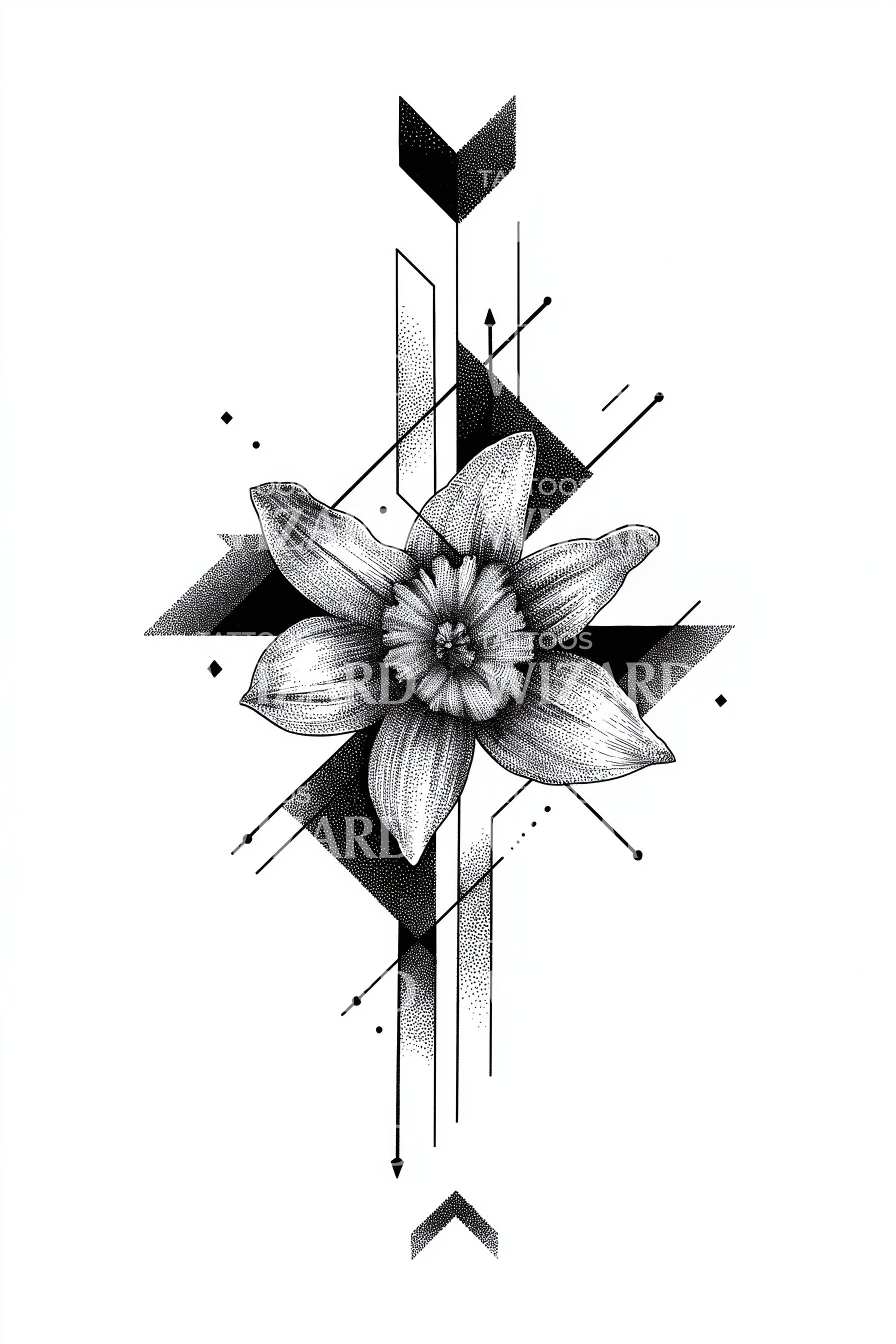 这款现代纹身设计融合了几何智慧与艺术美感,令人目不转睛。复杂的点描工艺勾勒出三角形和精准的箭头,点缀着细腻的花朵图案。结果?自然与对称美学之间展开了一场引人入胜的对话。无疑是前卫几何纹身艺术爱好者的完美之选。