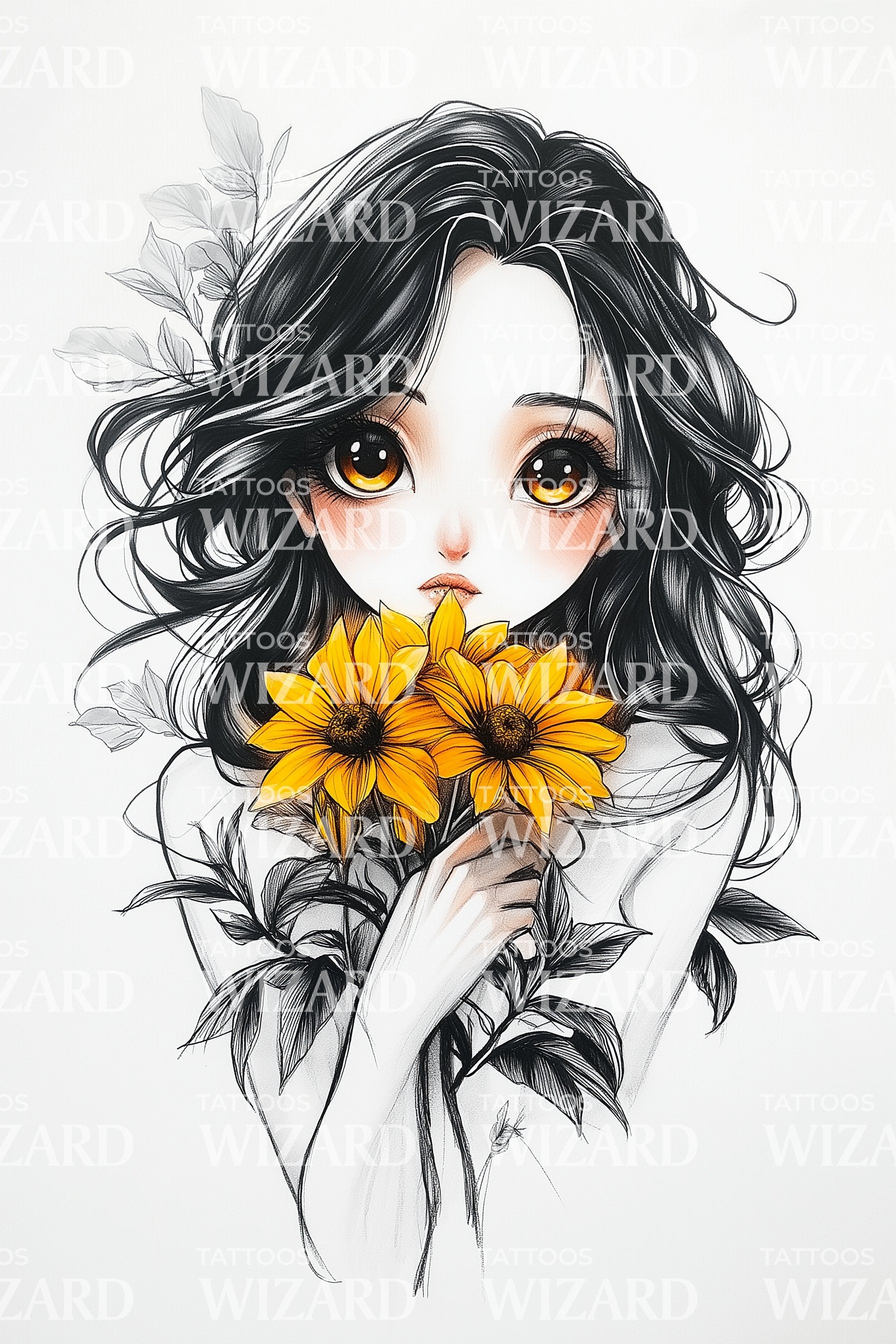 沉浸于充满活力的动漫世界,这款可爱的纹身设计展现了一位被万寿菊环绕的萌系少女,生动描绘出迷人的动漫女孩肖像。纯真与力量的完美融合,这款设计必将令每位动漫爱好者心动不已!