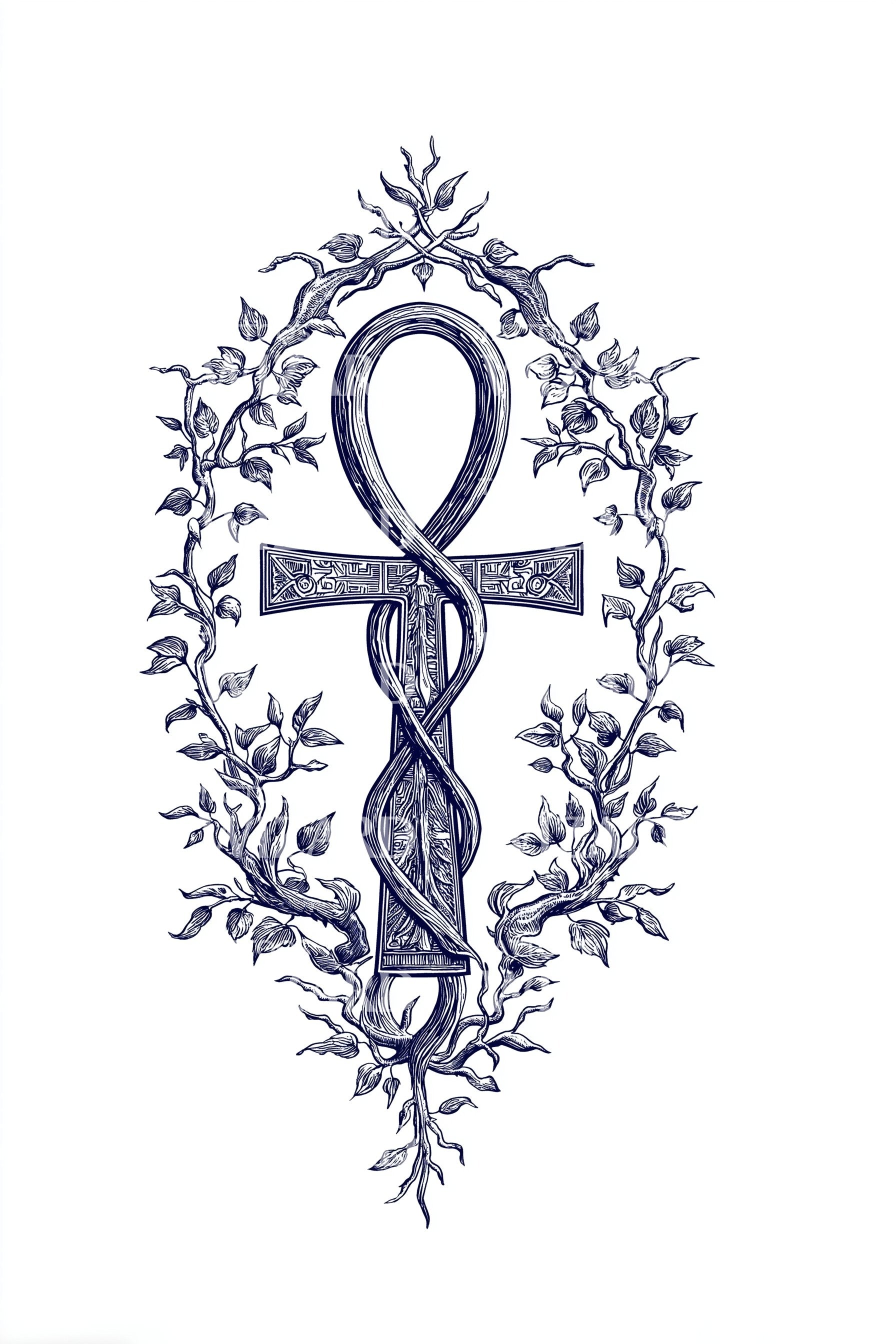 Ornate ankh cradled by laurel vines, etched with fine Egyptian filigree, glows with a sacred purple aura. The life key entwined with living branches unites eternity and renewal. Wearer feels calm sovereignty and rooted grace. Ideal placements: sternum or spine for vertical flow, forearm or calf for elegant, elongated framing.