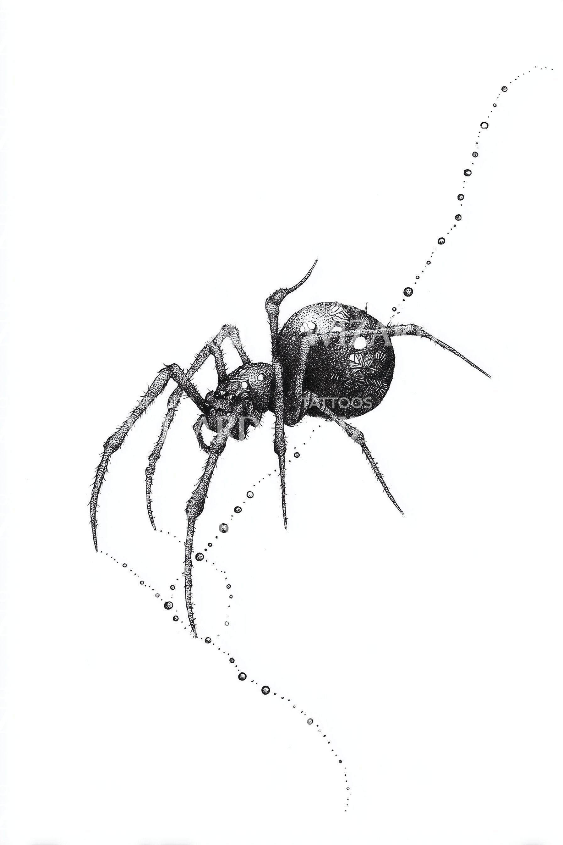 精细的微写实点描捕捉了一只优雅蜘蛛的宏观瞬间,这个昆虫世界的哨兵,其细腻的珠链轨迹在空间中弯曲。象征着耐心、工艺和蚂蚁般的勤奋,传递着大自然的静谧策略与低语般的韧性。感觉如同专注的宁静。非常适合纹在前臂、小腿、脊柱或锁骨处,点状路径自然流动。