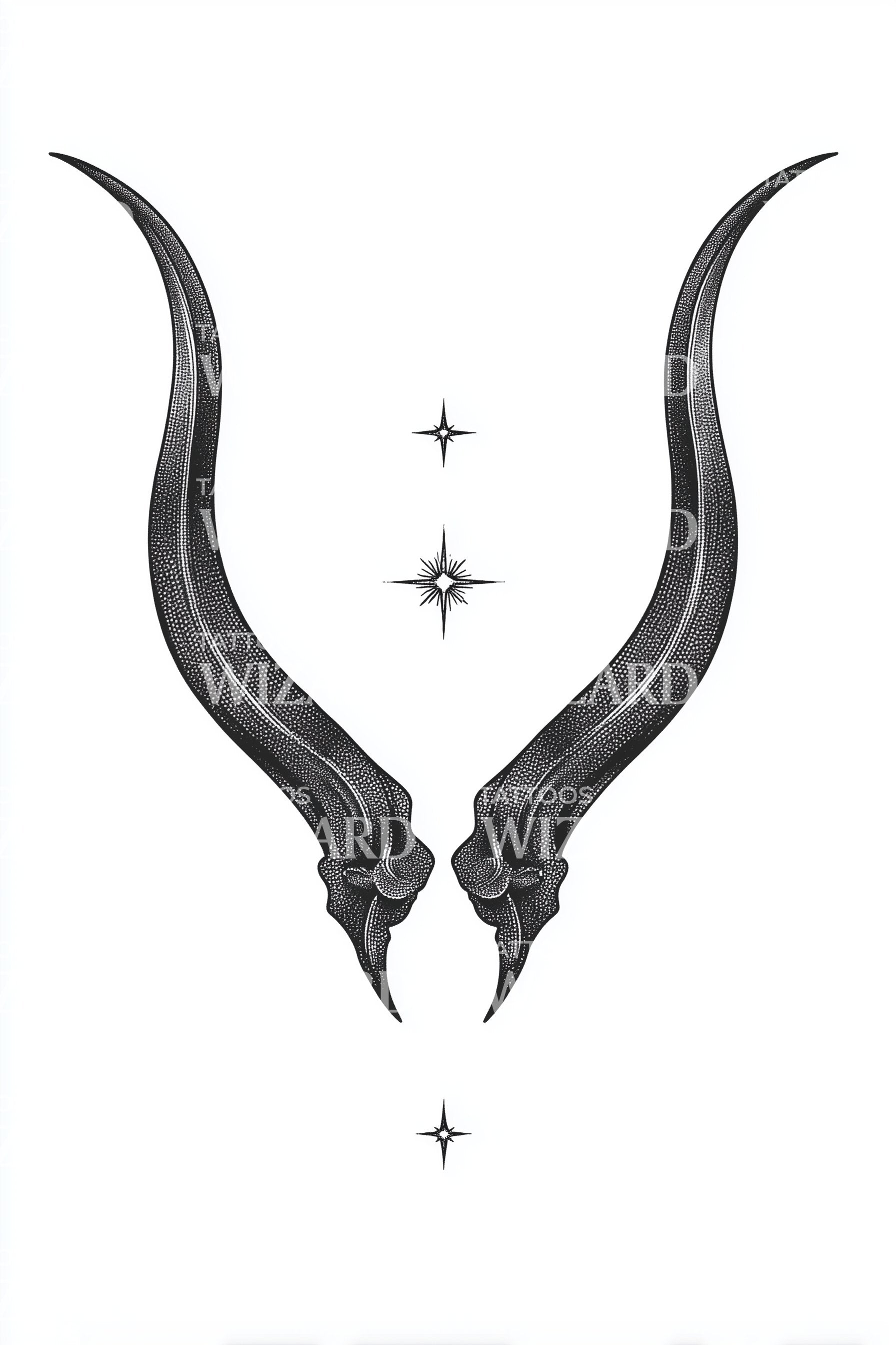 Fineline antelope horns rise in mirrored arcs, stippled and sleek, cradling three guiding stars. Minimal symmetry suggests poise and intention, the elegance of motion held in stillness. Symbol of grace, vigilance, and resilient spirit, this design settles on skin like quiet strength, centering the wearer with calm resolve.