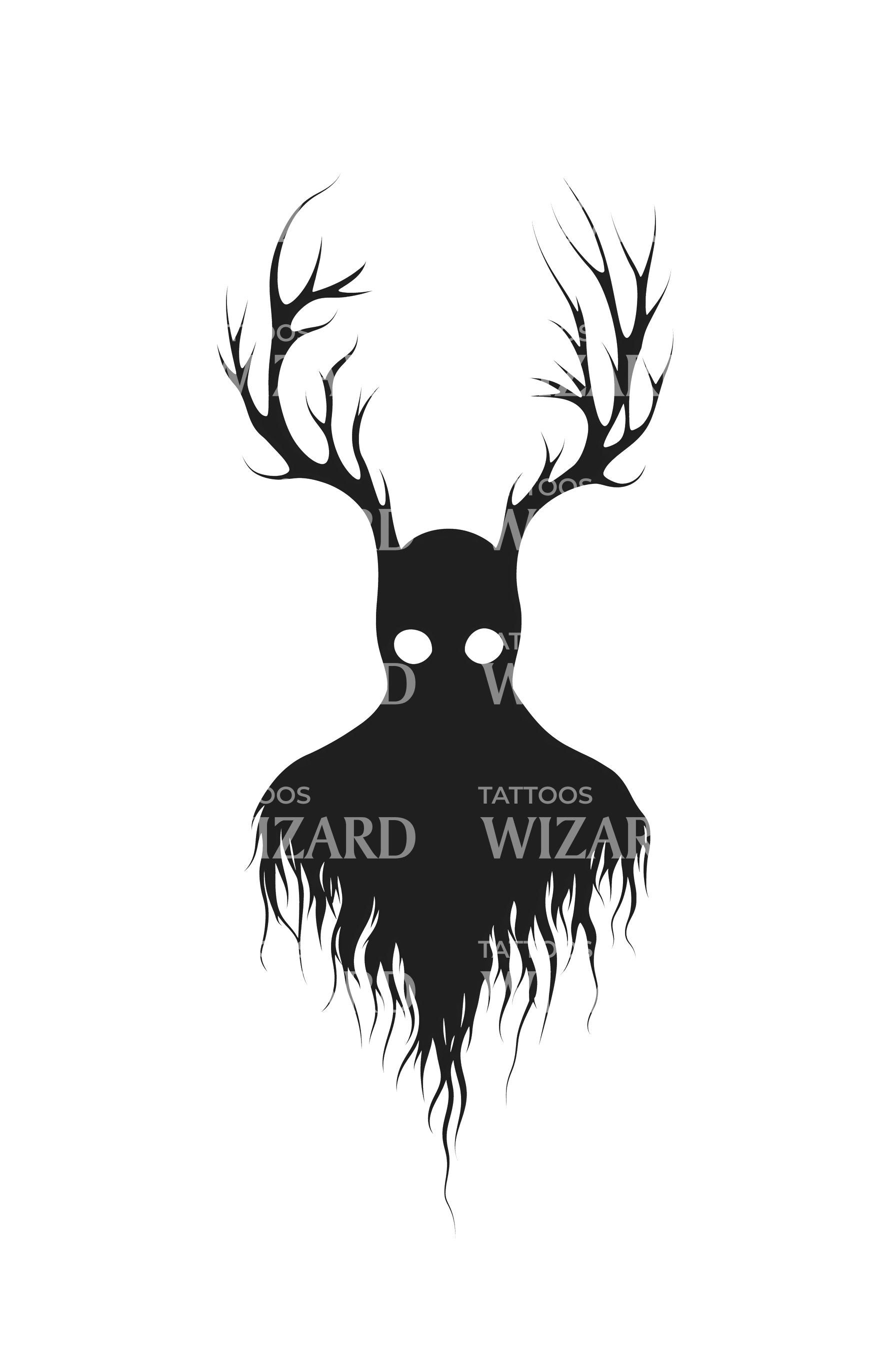 黑色剪影描绘一位戴兜帽的灵魂,枝状鹿角伸展,双眼闪耀,身体渐变为阴影般的根状火焰。它是本能与守护的森林图腾,象征着野性的直觉与边界之路。佩戴时,既有保护感,又静谧而强烈。适合位置:胸骨力量点、脊柱上升、腿肚步伐、前臂显眼处。