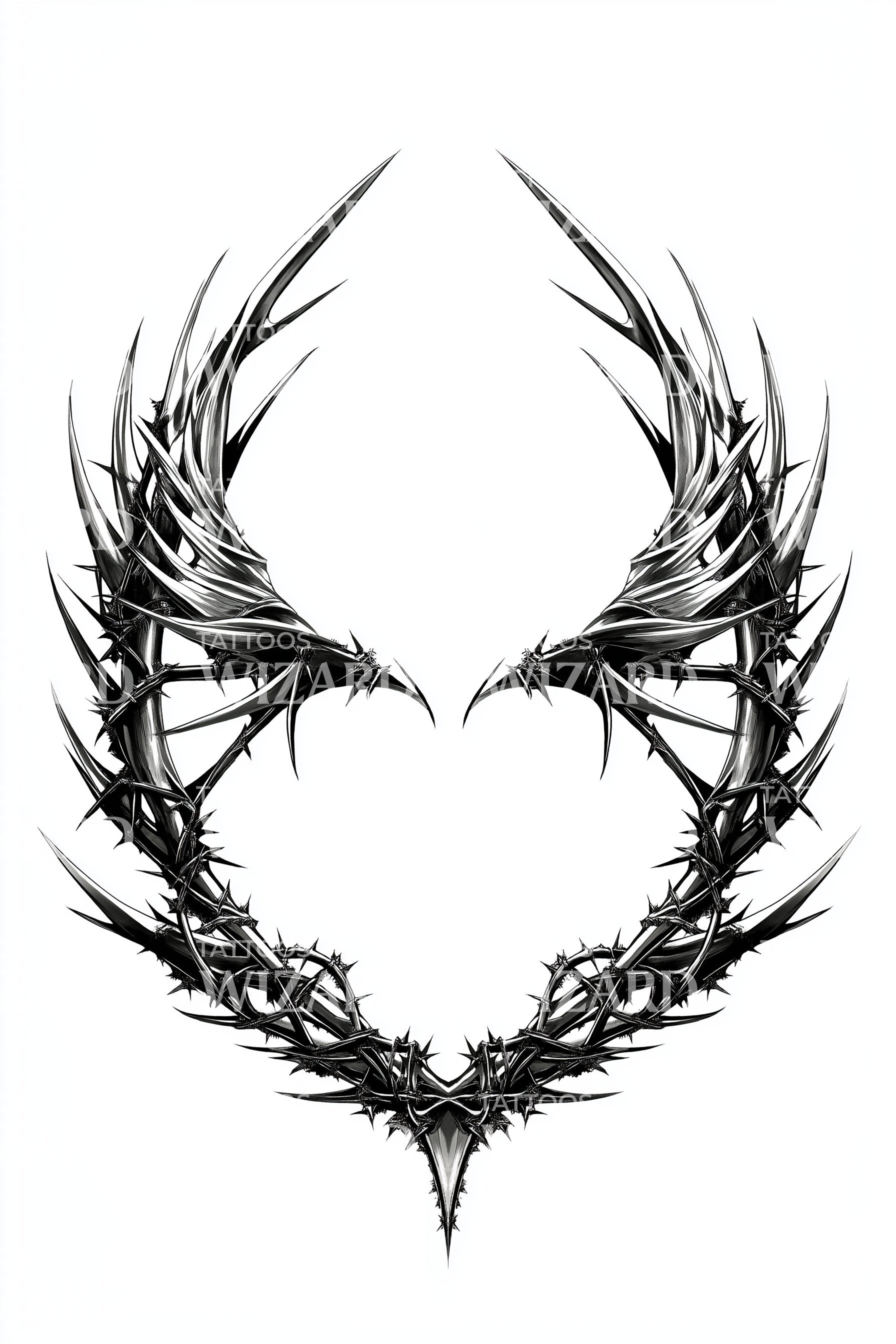 沉浸于这款黑色纹身设计带来的野性之中。它巧妙地将鹿角和荆棘融入花环,象征大自然的守护。探索这款设计中锋利与优雅的融合,每一个细节都捕捉了荒野不羁的精神。