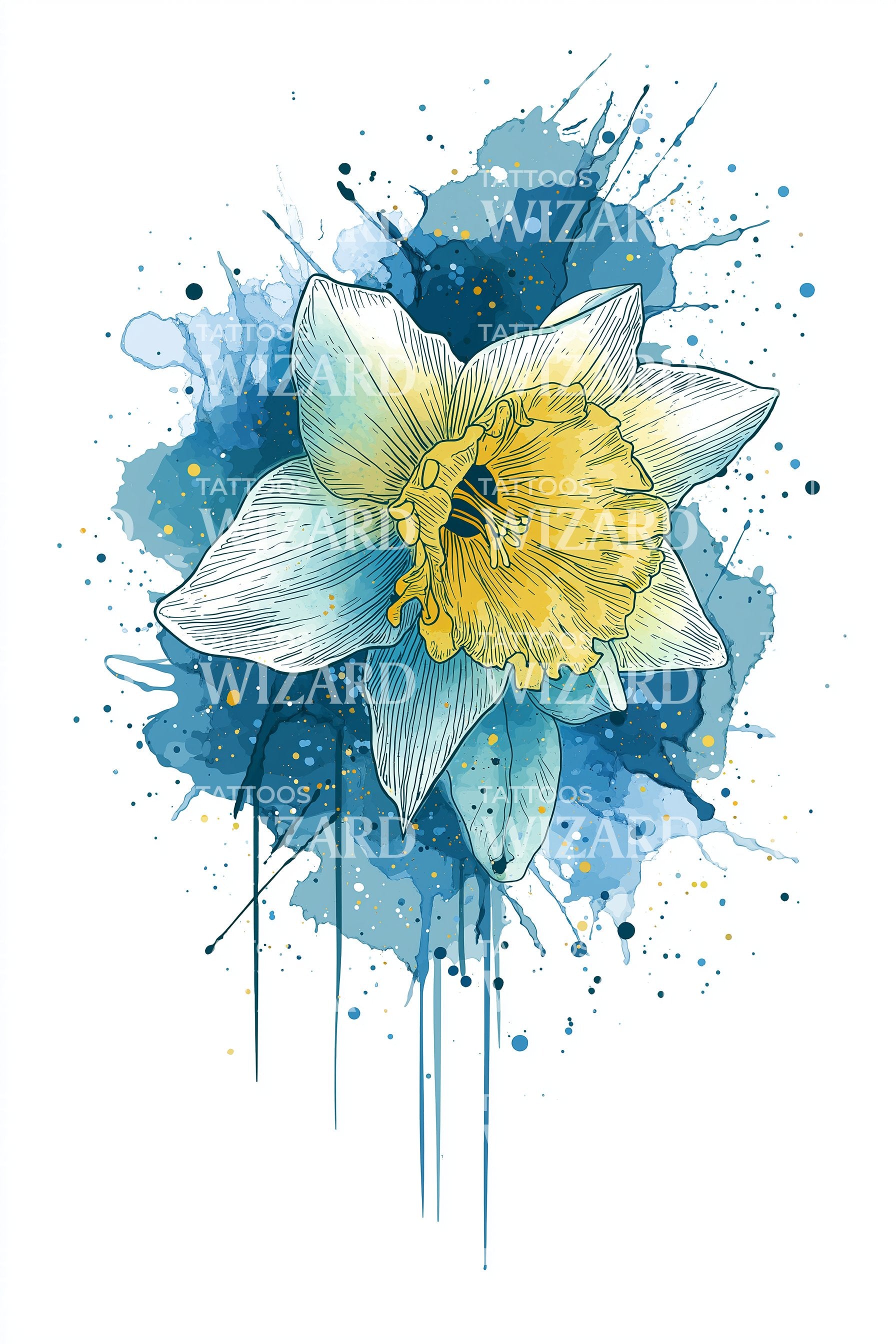 这款水彩纹身设计以充满活力的水仙花泼墨为特色,融合了清新多样的蓝色调。它的花卉之美表现力丰富且独特,将花朵的娇嫩与画家笔触的清新感完美结合。真正是一幅自然与艺术交织的画布。