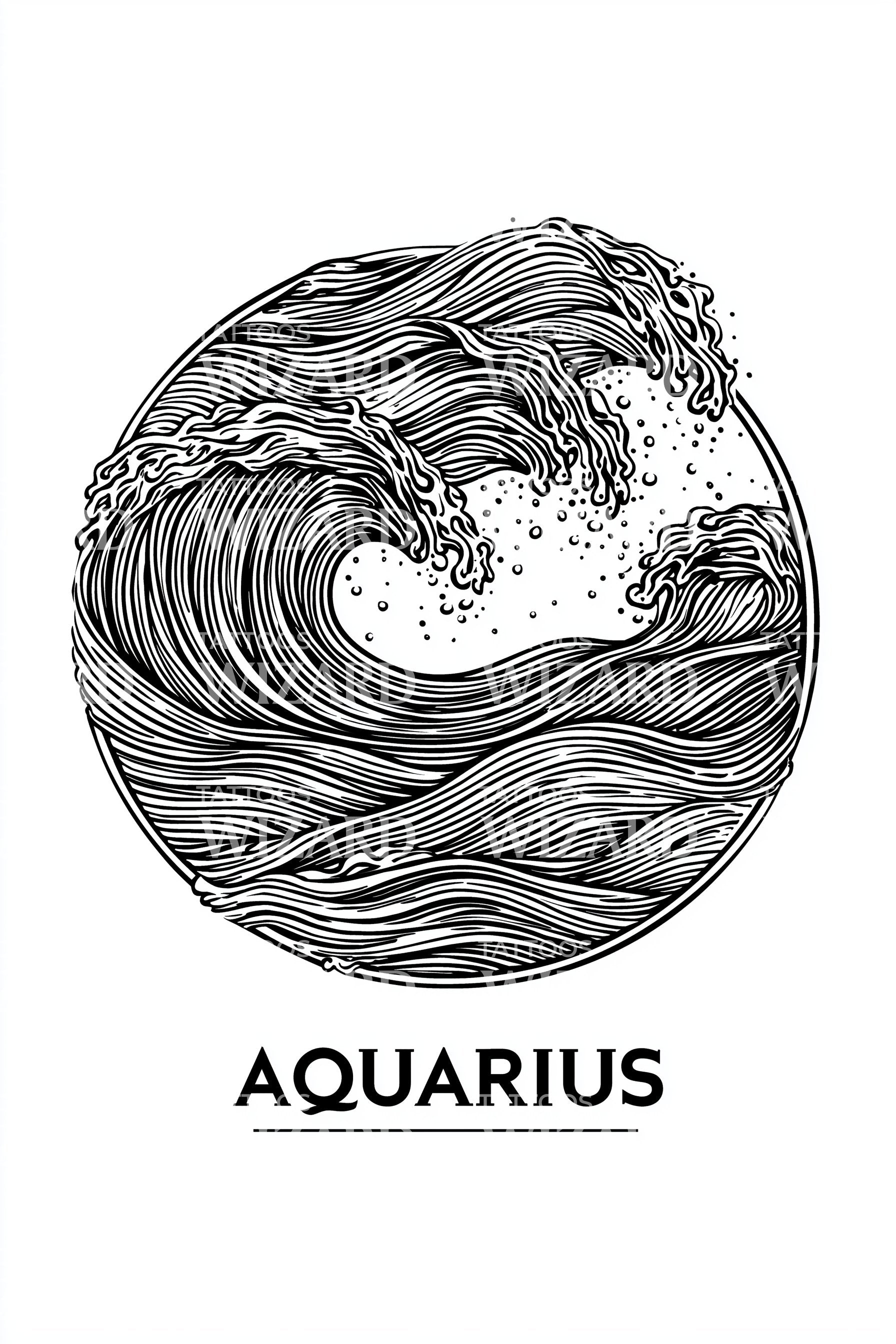 Blackwork tides curl inside a perfect circle, rippling lines like windsketched water, foam flickering as stars. Aquarius energy flows here: air-borne thought guiding water’s motion, waves as ideas breaking open. Worn on skin, the design feels cleansing, visionary, independent, a quiet orbit of courage and cosmic clarity.
