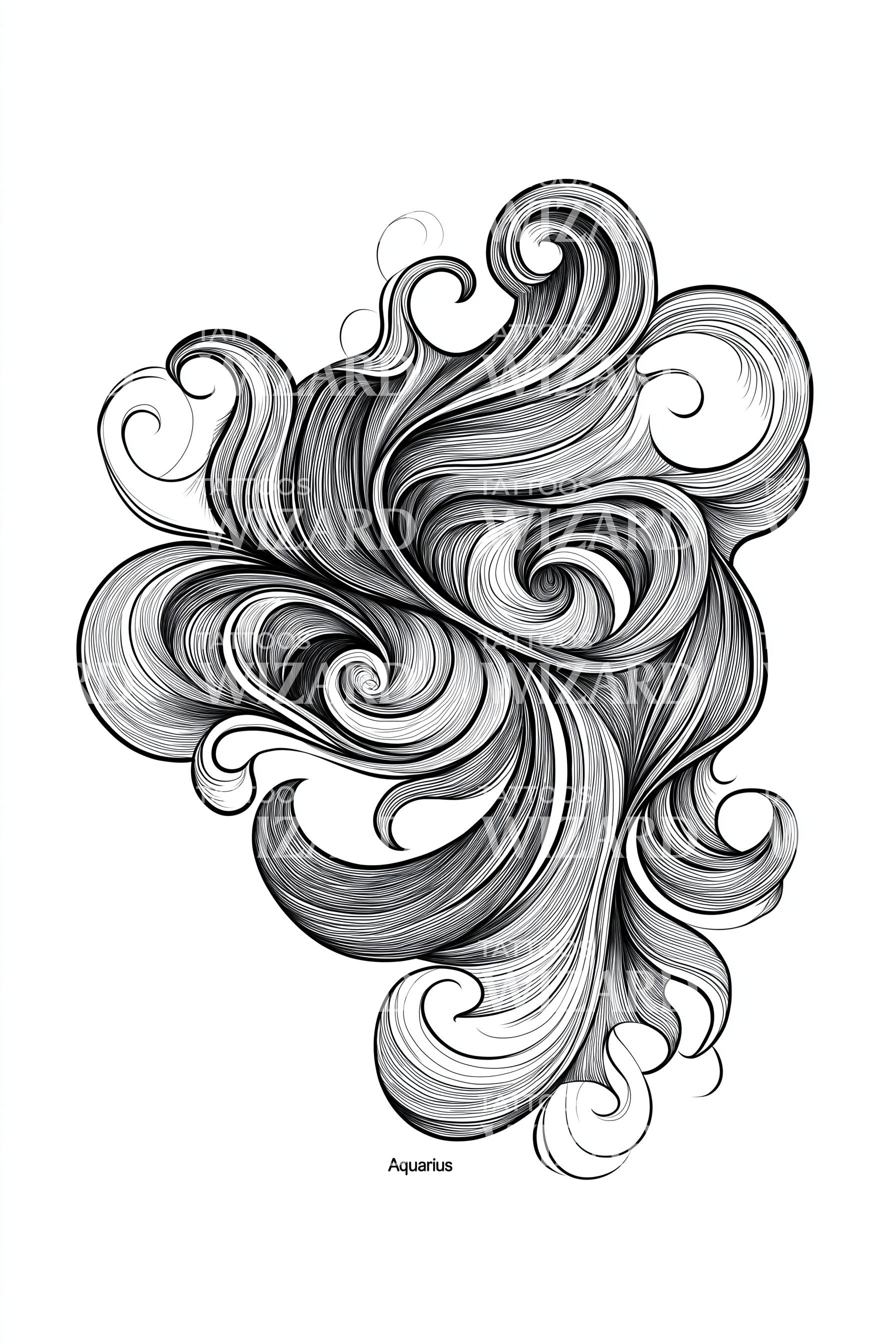 Sketch-fine currents spiral into airy waves, a monochrome constellation of flowing curls. Abstract tides meet wind, capturing Aquarius as the water-bearer of ideas and change. Lines pulse like a living current, inviting clarity, independence, and forward motion. Wear to feel fluid, inventive, and endlessly in flow, each day.