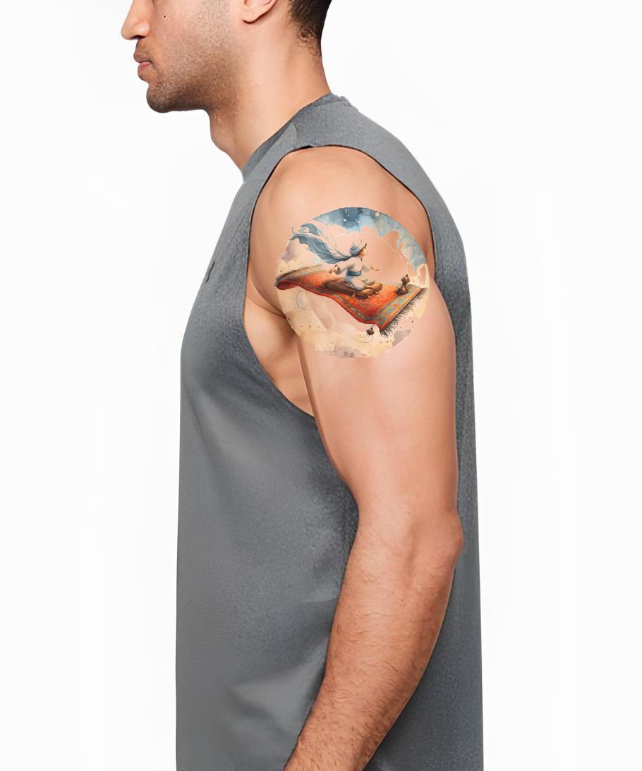 拥抱一个魔法的世界,尽在我们阿拉丁灵感的水彩纹身设计中。展示神秘的月光场景与标志性的魔法地毯交织在一起,这个设计捕捉了著名电影的迷人本质。非常适合电影爱好者和富有幻想的灵魂,这件作品为虚构的怀旧注入了生命。