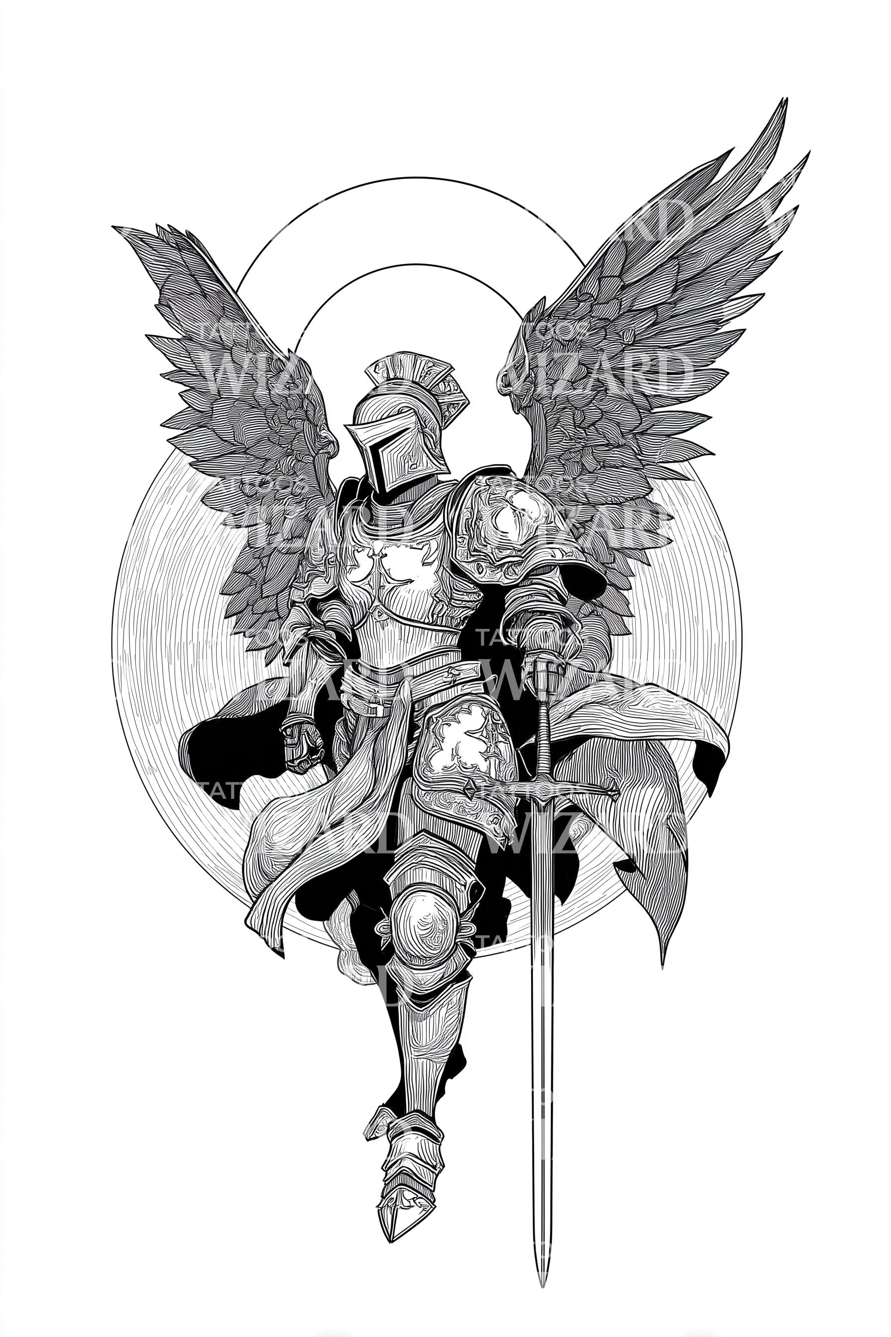 沉浸于精神象征的艺术纹身设计中。借助大天使的神圣力量,它展现了一位手持利剑的英勇天使战士,传递守护者与圣人的故事。这件作品让你每天都能在肌肤上感受到天界守护者的力量。