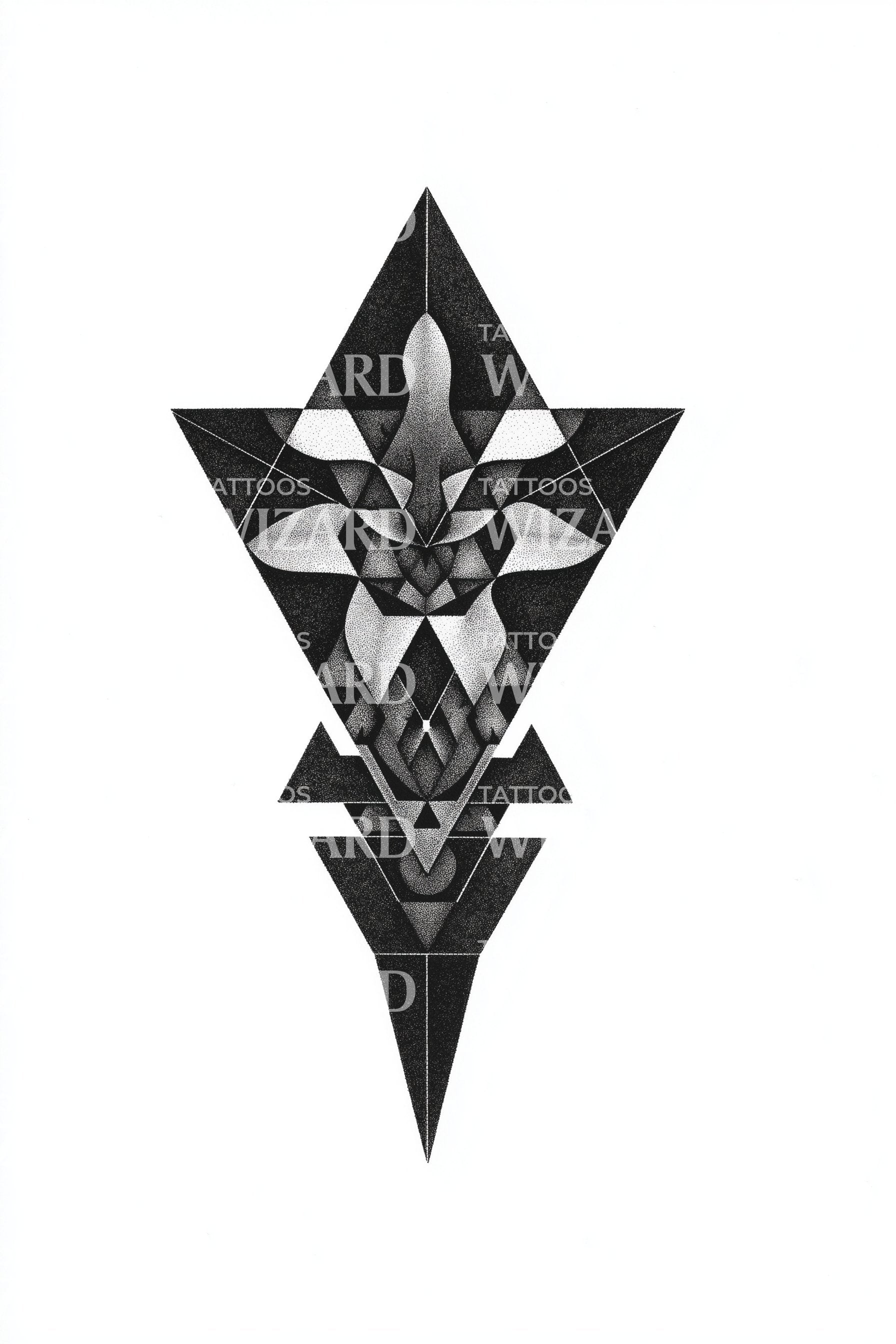 这款几何纹身设计将锐利的箭头图案与复杂的花卉纹样相结合,独特地融合了力量与优雅。采用精细的黑色工艺打造,这一设计展现了几何的精致锋芒。非常适合欣赏传统纹身美学前卫风格的您。