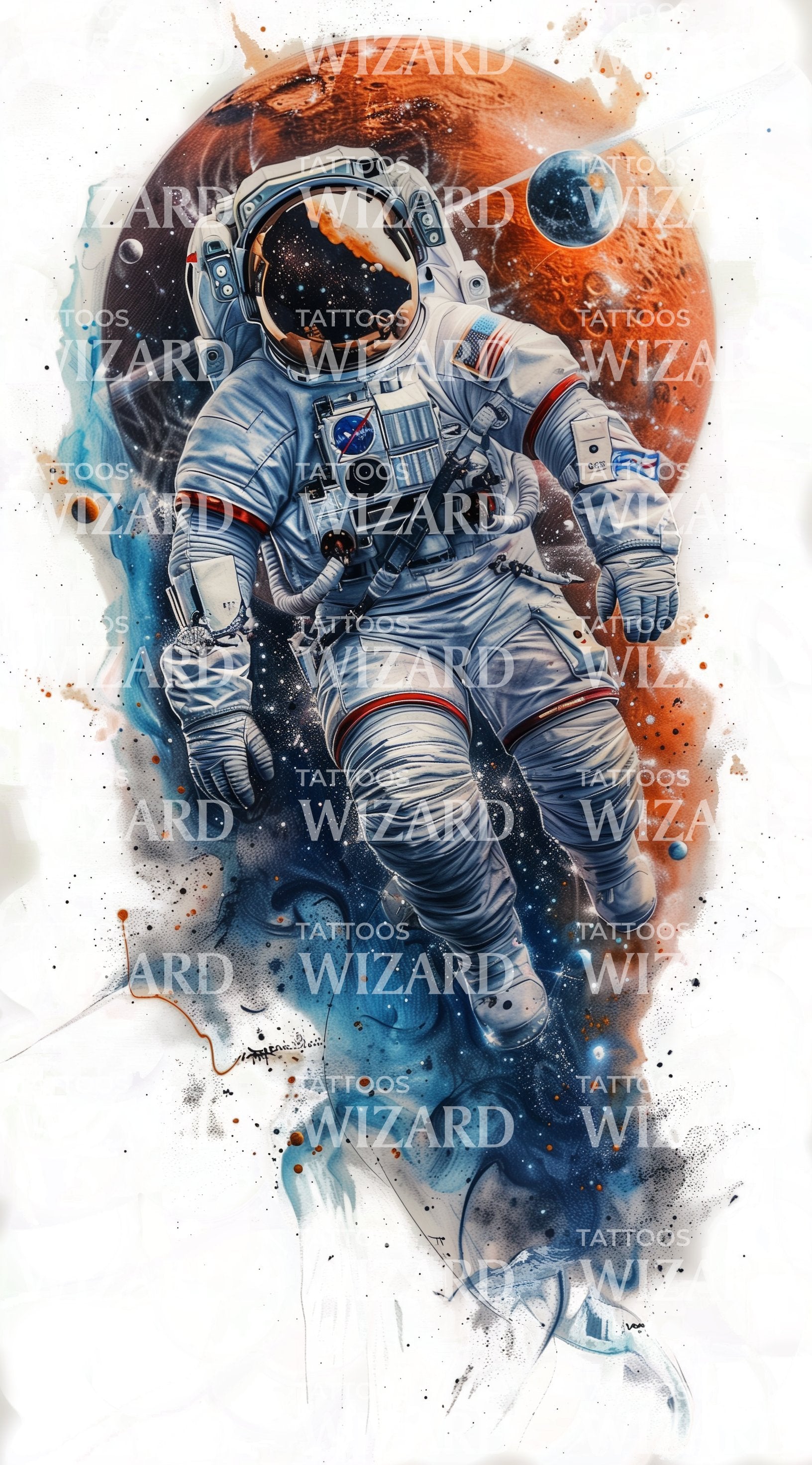 踏入宇宙,尽享这款水彩纹身设计,融合了美国的大胆与无限的宇宙。它美丽地展示了一位勇敢的宇航员在星星闪烁的银河中探索。这件作品非常适合那些志向远大并对太空充满好奇的人。