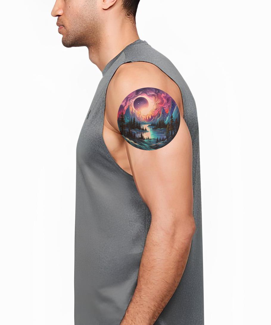 体验极光的震撼美丽,印在你的肌肤上,这款迷幻的几何纹身设计。展现出巍峨的山脉、茂密的松树和迷人的北极光,全部封装在独特的圆形中。每次佩戴都令人眼花缭乱,同时表达你对自然奇观的热爱。