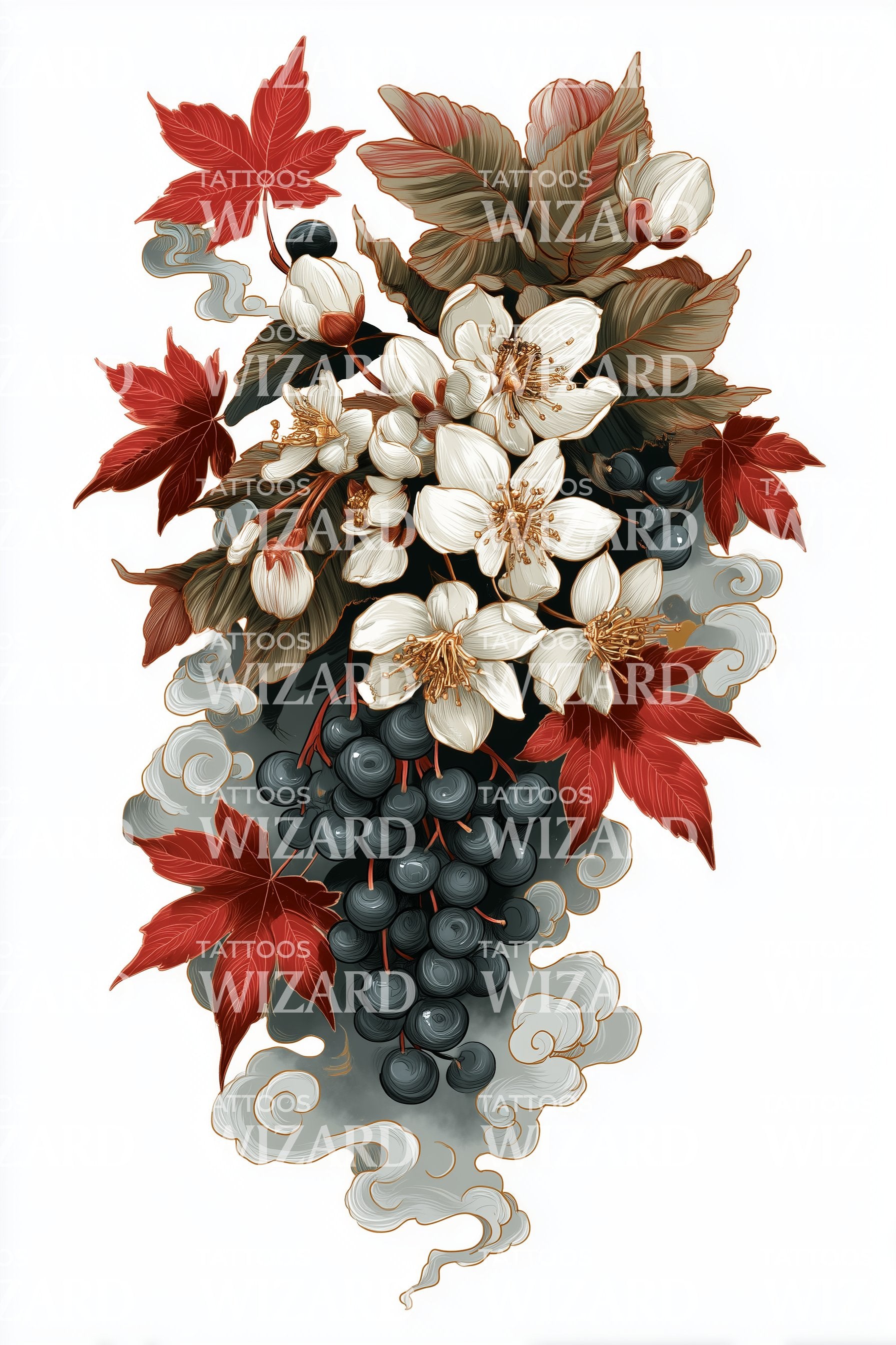 展现您对秋日丰收的热爱,尽在我们的插画风纹身设计中。鲜艳的葡萄串与奇幻的叶子交织,形成独特的果实花束。点缀以精致的花卉装饰,这不仅是一款纹身,更是对大自然永恒魅力的见证。