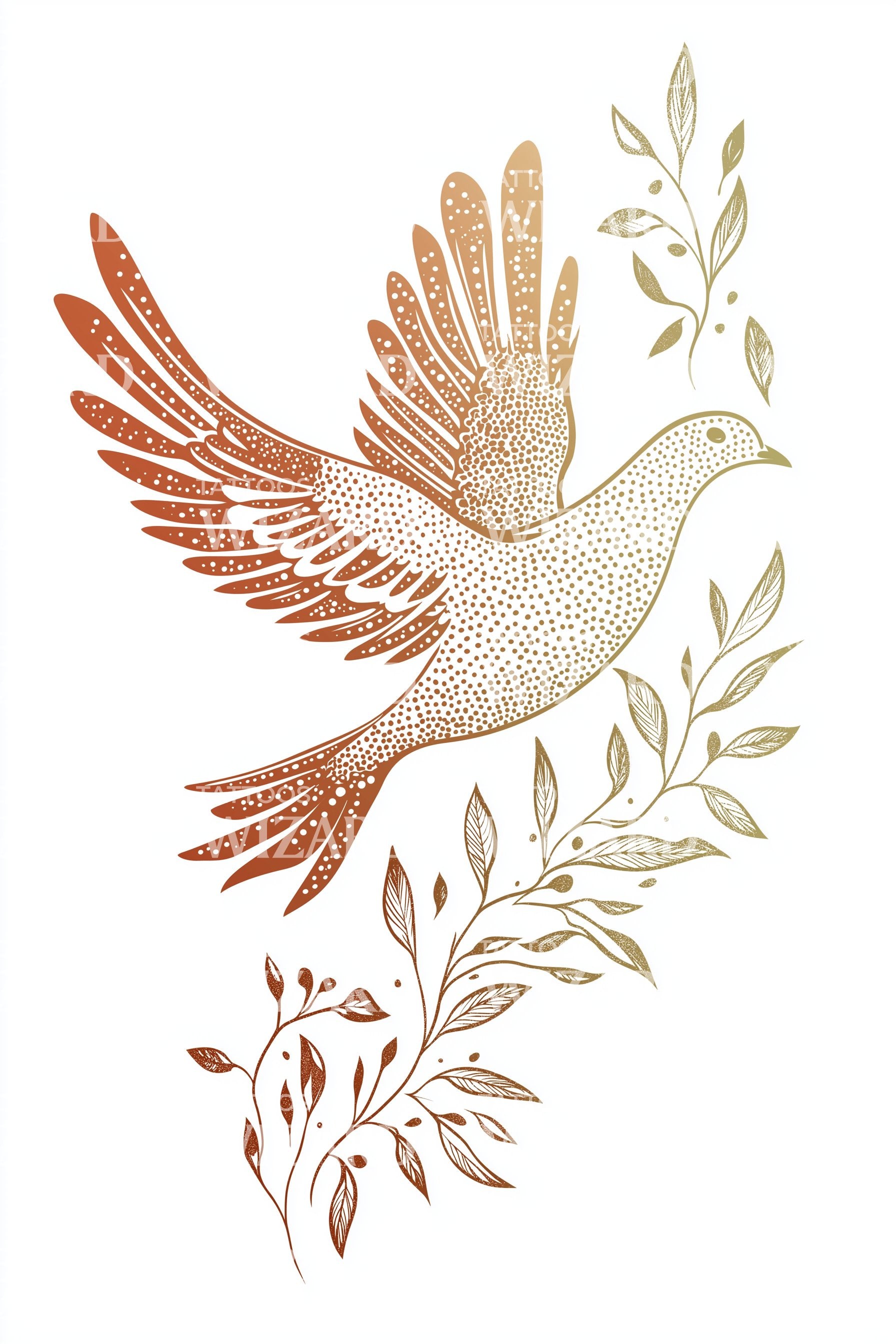 这款水彩纹身设计以一只宁静的鸽子完美诠释了和平,鸽子被鲜艳的橙色秋叶环绕。水彩的精妙融合赋予作品艺术感和感染力。它是和平、宁静与优雅秋日变换的惊艳象征。非常适合那些重视纹身中深刻艺术意义的人。
