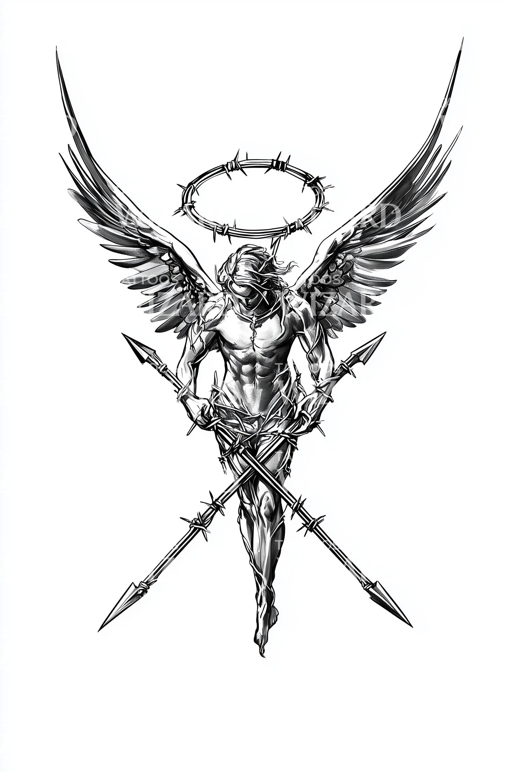 Black & grey steel-feathered wings spread wide as a winged avenging angel, a warrior-saint, descends, head bowed beneath a barbed halo, crossed spears bristling with judgment. Stark shading carves divine muscle and torn grace. Symbolizing justice tempered by mercy, this design wraps its wearer in fearless resolve, humility, and purpose.