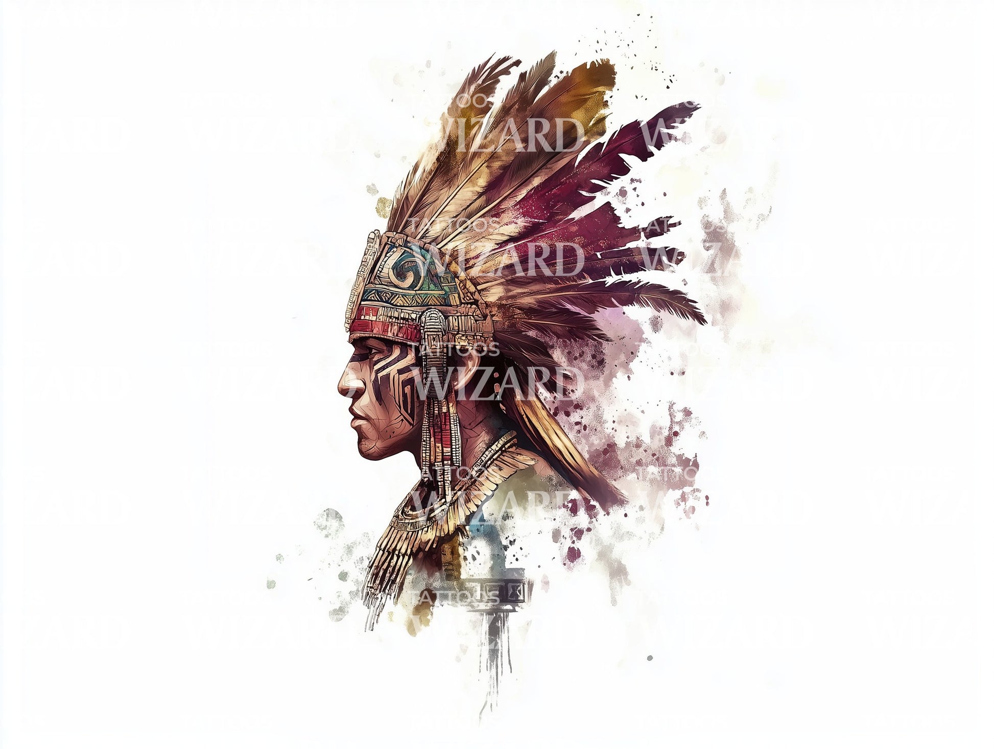 用这款水彩阿兹特克战士纹身设计来拥抱历史和文化。它富含部落象征,展现了一位佩戴华丽头饰的战士,细节精致。这件充满表现力、色彩丰富的作品捕捉了阿兹特克的韧性和力量的精神。非常适合那些被生动的历史身体艺术所吸引的人。