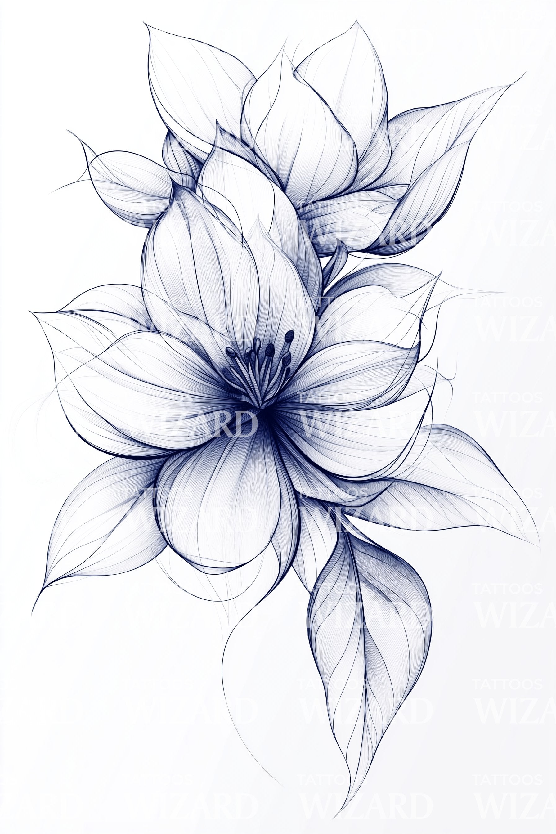 沉浸于这款蔚蓝色纹身设计的优雅流动之中。充满花瓣般完美的细节,这件花卉杰作将浓墨的鲜明对比与柔和的花朵设计融合,呈现出大胆与细腻色调的轻松结合,打造出令人惊艳的美学宣言。