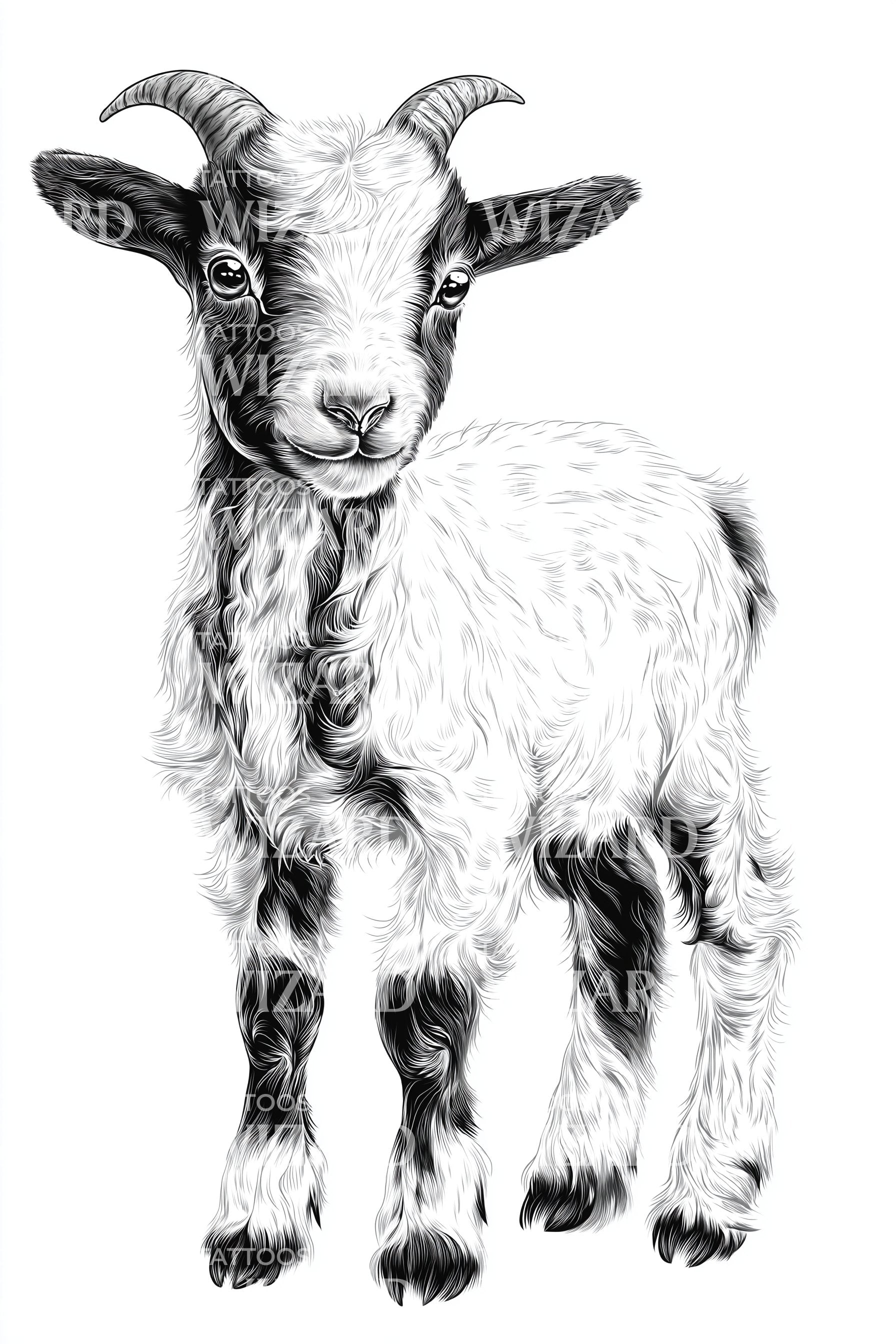 Soft, lifelike linework captures a standing kid goat, fur whorls and bright eyes rendered in crisp black and gray realism. Symbol of humility, curiosity, and resilient beginnings, this farm animal spirit mirrors nature’s guidance. Wearing it feels grounded yet hopeful, inviting playful courage and tender, wholehearted freedom, everyday wonder.