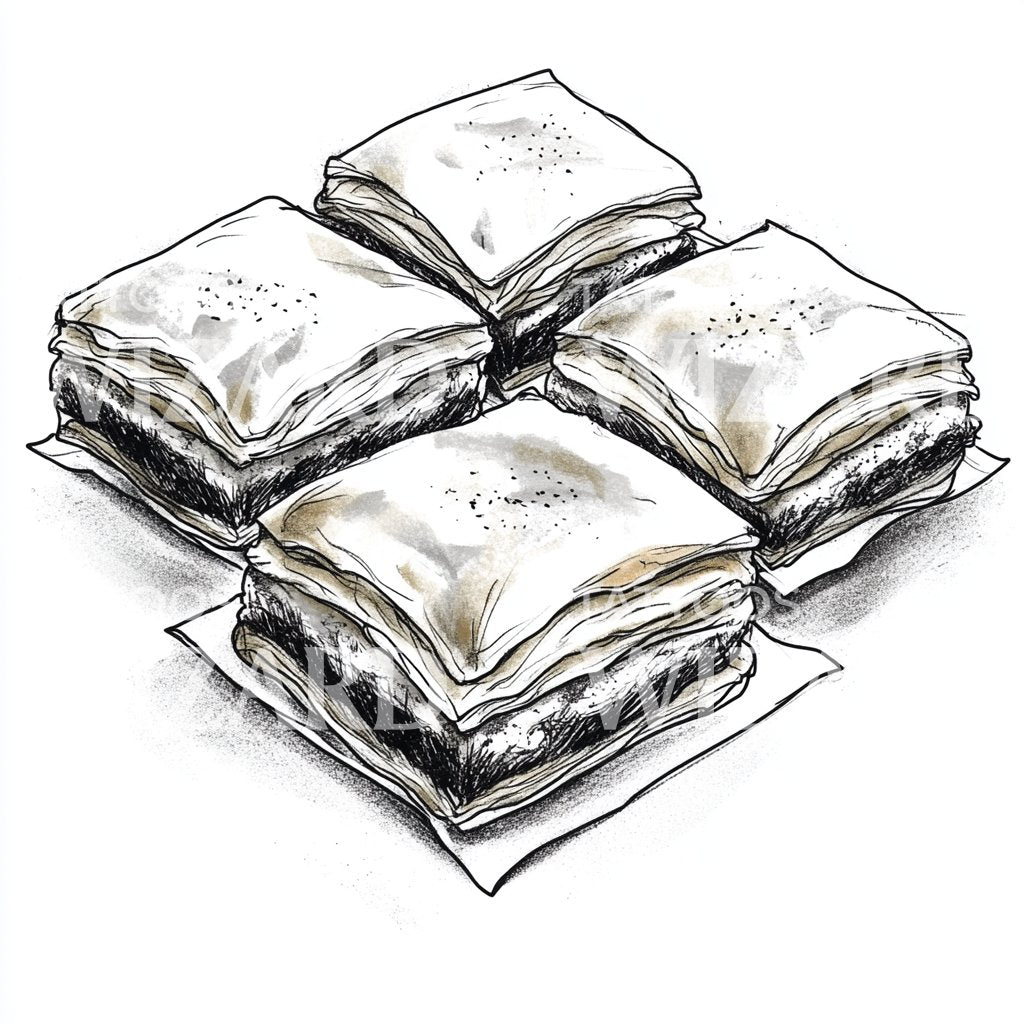用这个独特的黑色纹身设计来满足你的甜食欲望,设计中包含了受人喜爱的甜点——巴克拉瓦。对于美食爱好者来说,这幅素描风格的作品精致地捕捉了这款甜点的美妙层次。艺术与美食的完美结合,为任何肌肤画布增添了一丝奢华的气息。
