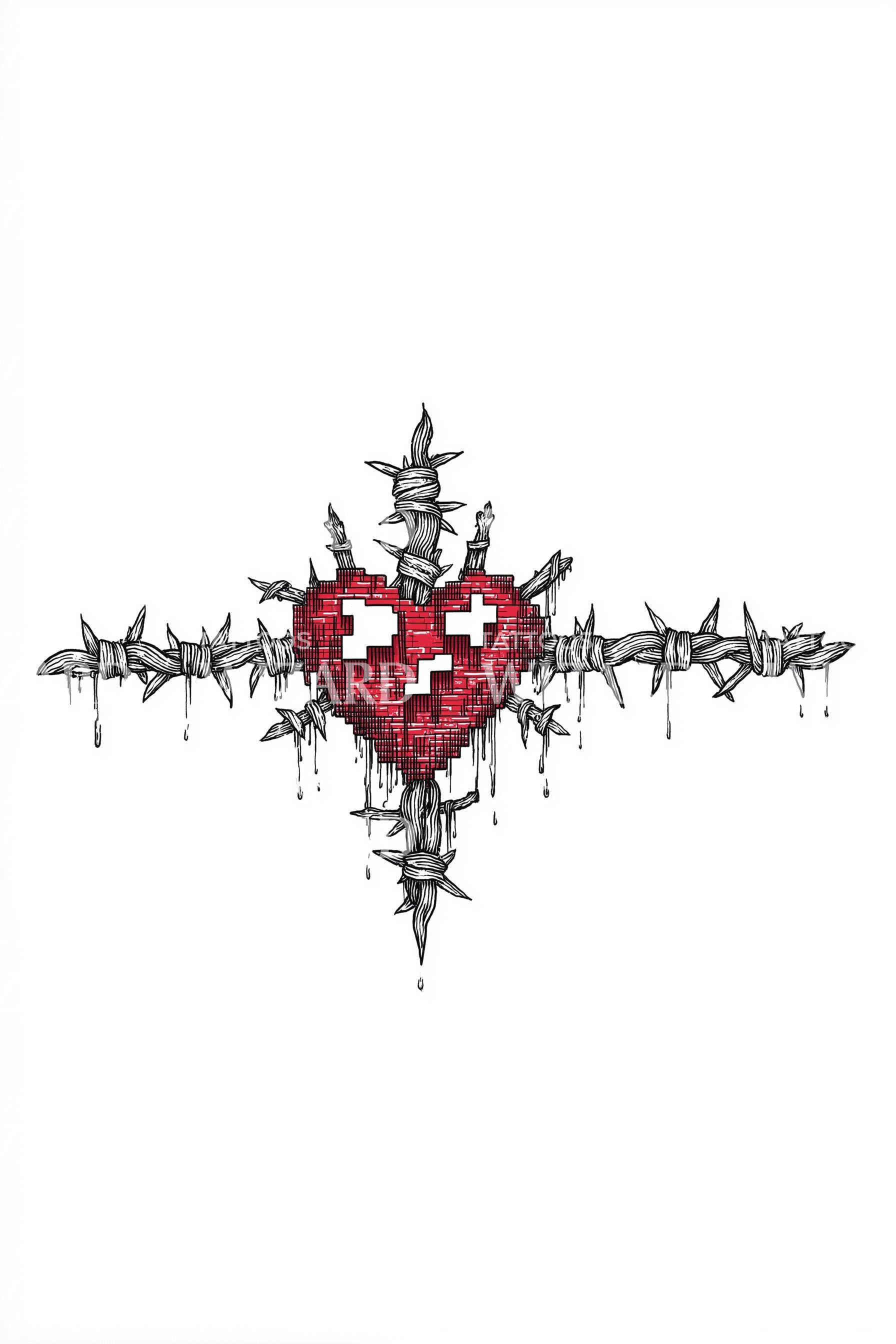 Barbed cross stretches wide, dripping blackwork, cradling a stitched red heart cut by white crosses. Sharp linework meets pixel texture, a modern Sacred Heart. Symbolizes faith that survives thorns, and love protected yet tested. Wear it to feel resilient and fiercely alive. A vow etched in red glow.