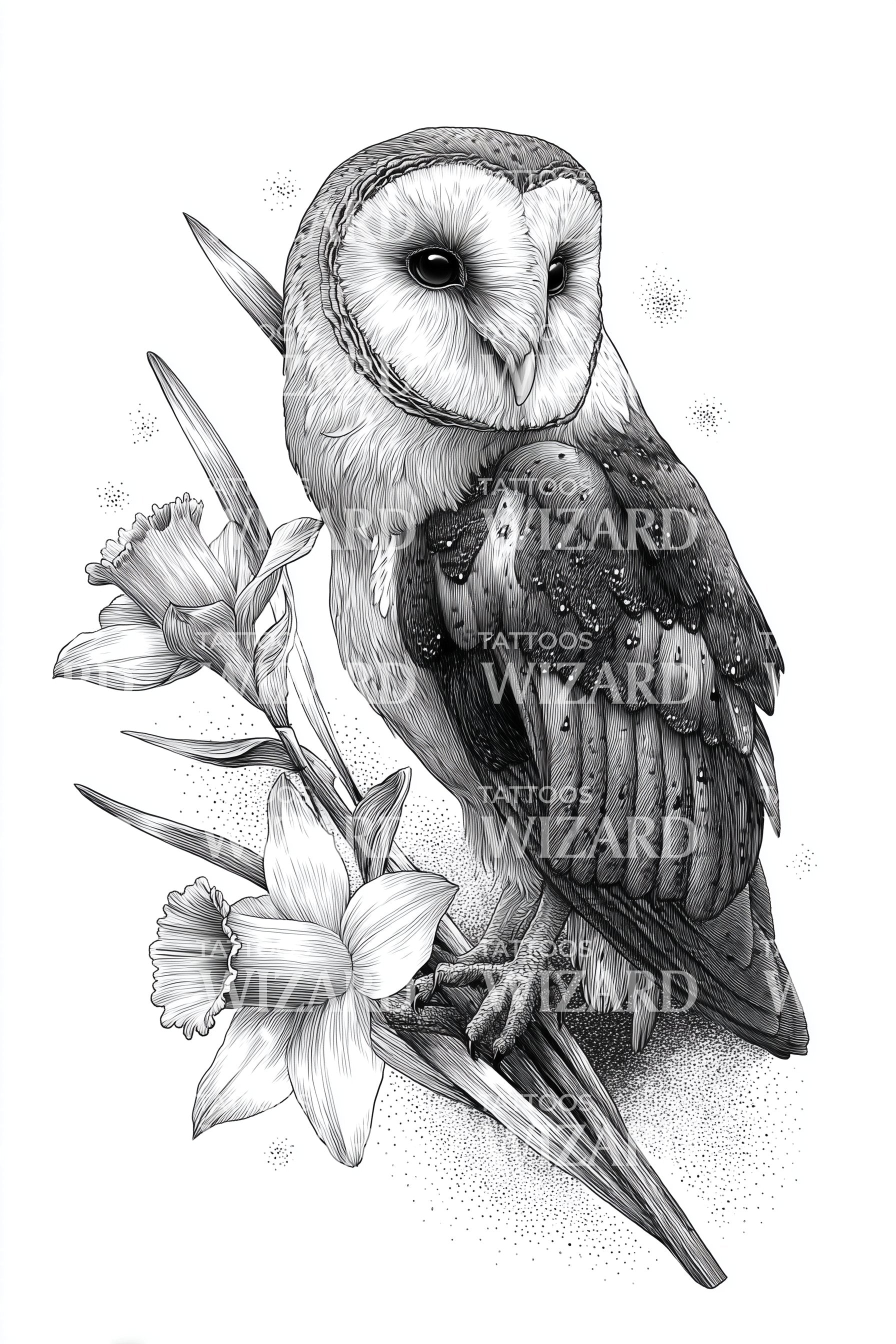 沉浸于大自然的卓越之美,这款逼真的黑灰色纹身设计艺术细腻,描绘了一只威严的猫头鹰栖息在质朴的谷仓中,周围环绕着绚丽的水仙花。非常适合热爱自然和写实风格纹身艺术的你。