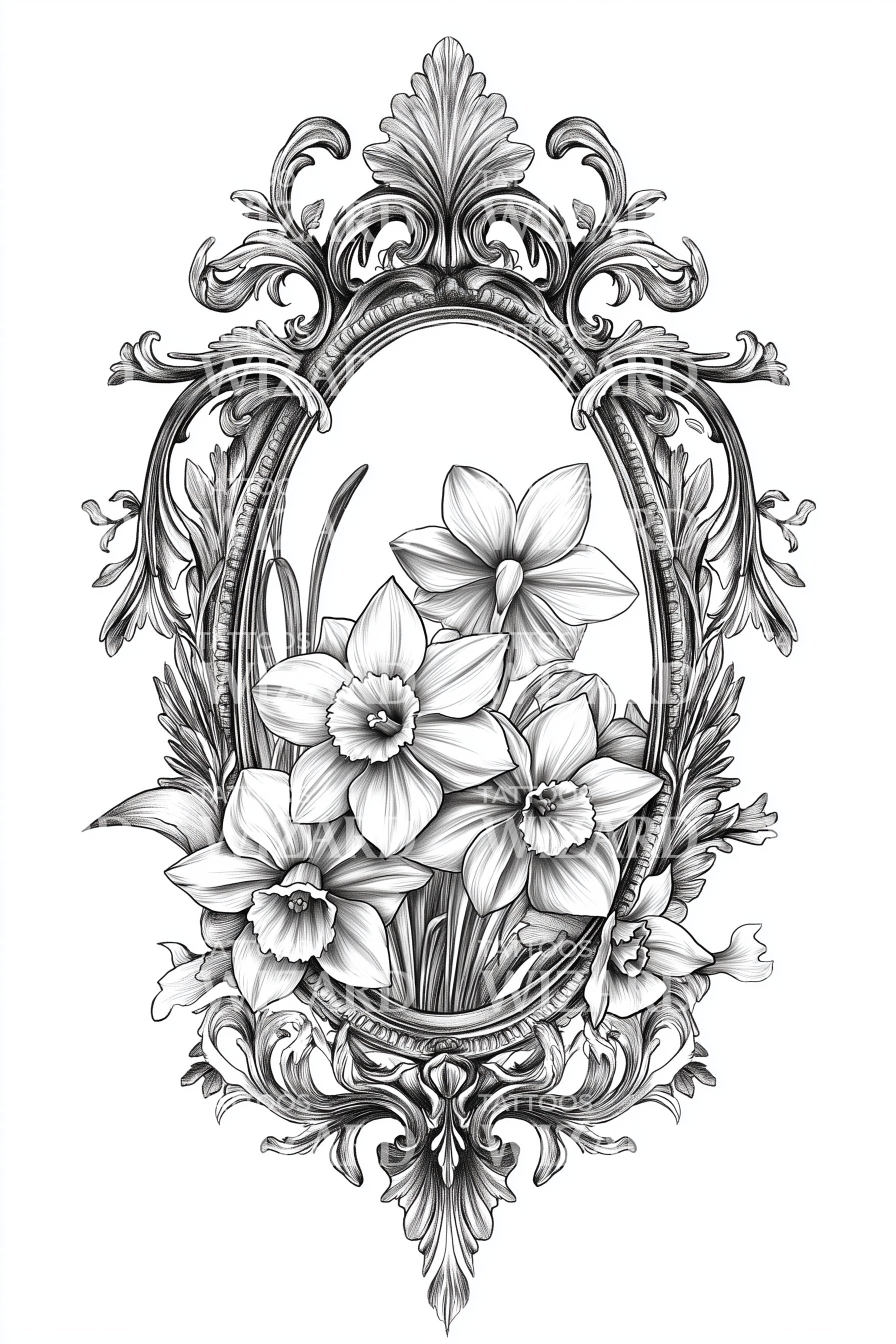 这款纹身设计融合了巴洛克的优雅与复古的魅力,展现出精致的花卉装饰,镶嵌于细腻的浮雕肖像框中。作为对昔日装饰美学的复杂致敬,这一设计呈现出永恒迷人的美丽印记。非常适合追求永恒且大胆表达的人士。