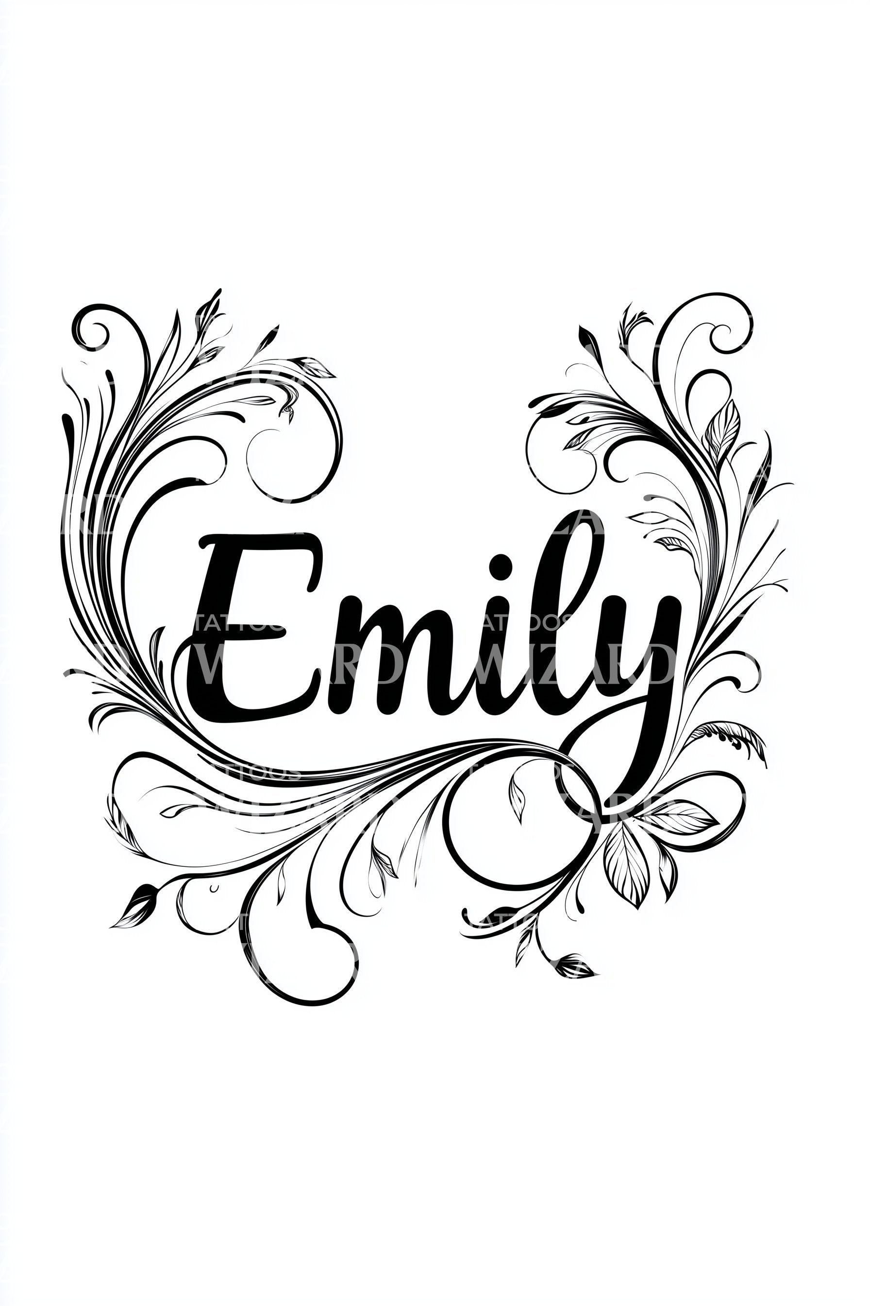 Baroque scrolls unfurl in inky vines and feathered leaves, cradling the name Emily in bold, flowing script. Each ornamental flourish whispers heritage and growth, a living wreath for devotion and legacy. Wearing it feels regal yet intimate, like carrying a quiet garden of courage over the heart, always.