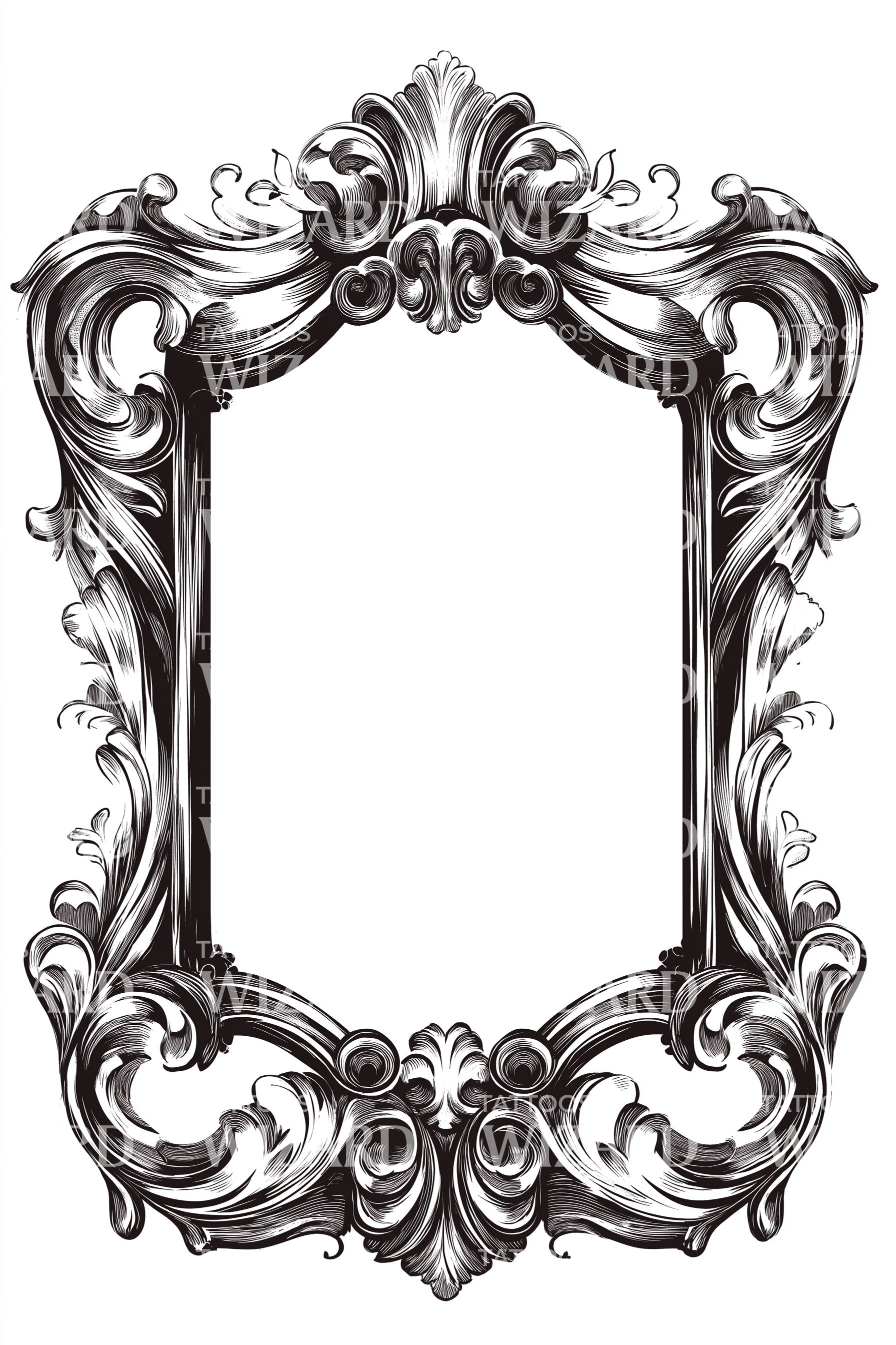 散发着精致优雅,这款装饰性纹身设计充满了巴洛克艺术风格。拥有华丽的边框,完美地包裹着复古魅力和复杂的卷轴纹饰,这件作品作为您肌肤上的精美永久装饰,将优雅与永恒的魅力完美融合。