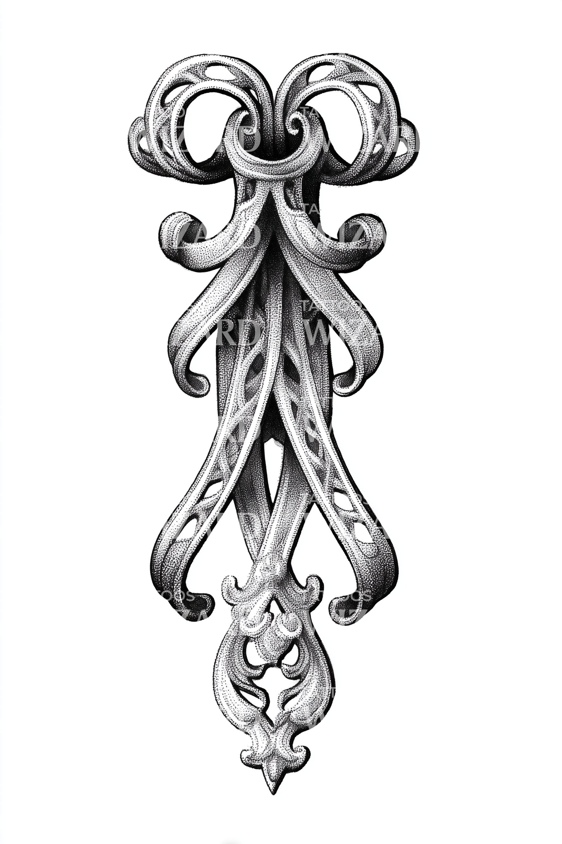 Baroque scrollwork unfurls in elegant filigree, latticed ribbons and a pointed finial rendered in velvety stipple. Interlaced curves symbolize continuity, devotion, and the protective knot of legacy. Victorian grace meets modern restraint, wrapping the wearer in poised serenity, quiet power, and heirloom allure, an ornamental whisper of resilience.