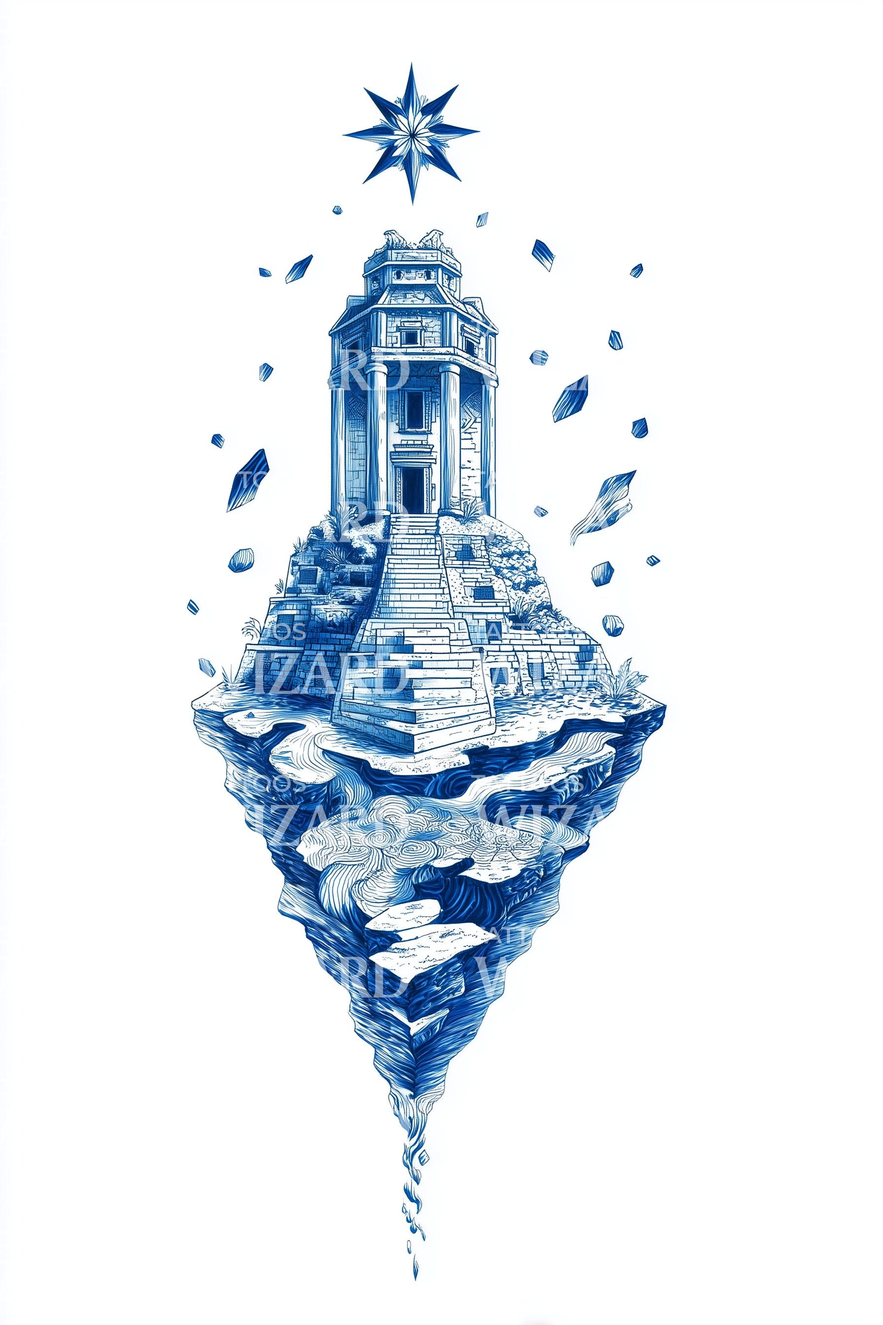 一个描绘孤岛的插图纹身设计,岛上耸立着一座石质纪念碑——一座永恒的灯塔直指天空。雕刻的台阶螺旋向上,通向一颗指引的星星,蔚蓝的色调洒满海洋与天空。构图、清晰的线条和大胆的阴影共同营造出一个象征指引与希望的航海符号。