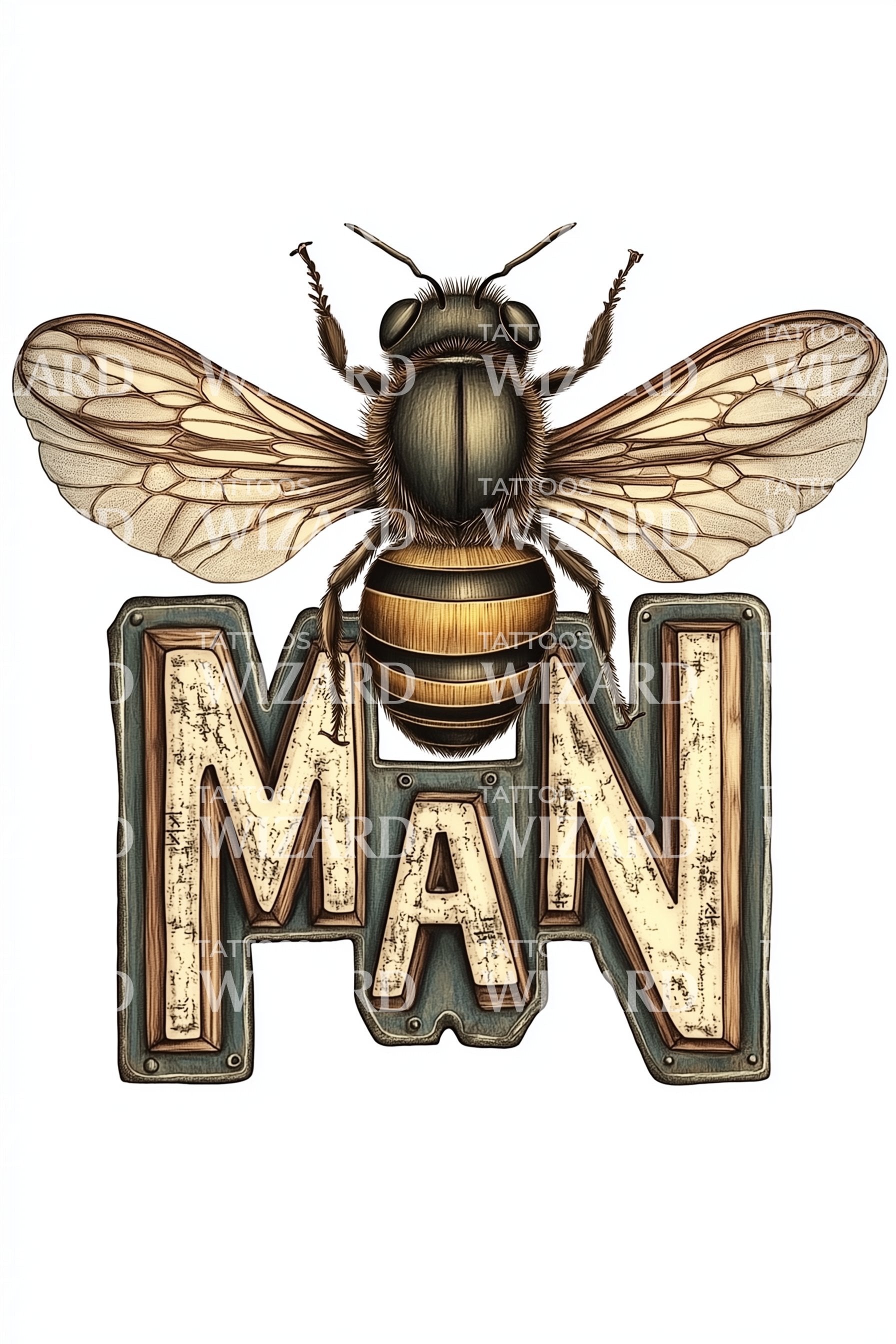 Manchester emblem reimagined: a finely etched bee with translucent, veined wings settles on weathered block lettering reading MAN, styled like a riveted foundry plaque. Symbol of industry, community, and persistence, it hums of graft and grace, gifting the wearer steady pride, strength, and everyday grit and enduring solidarity.