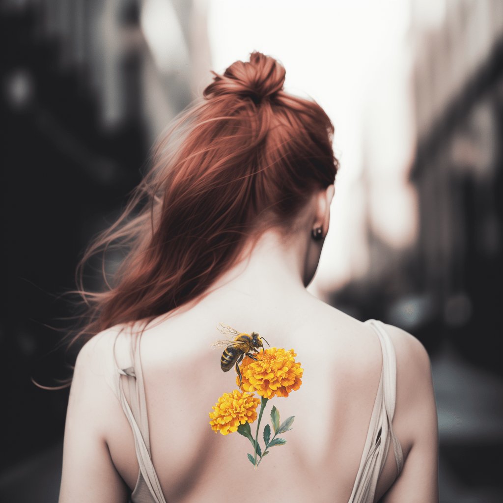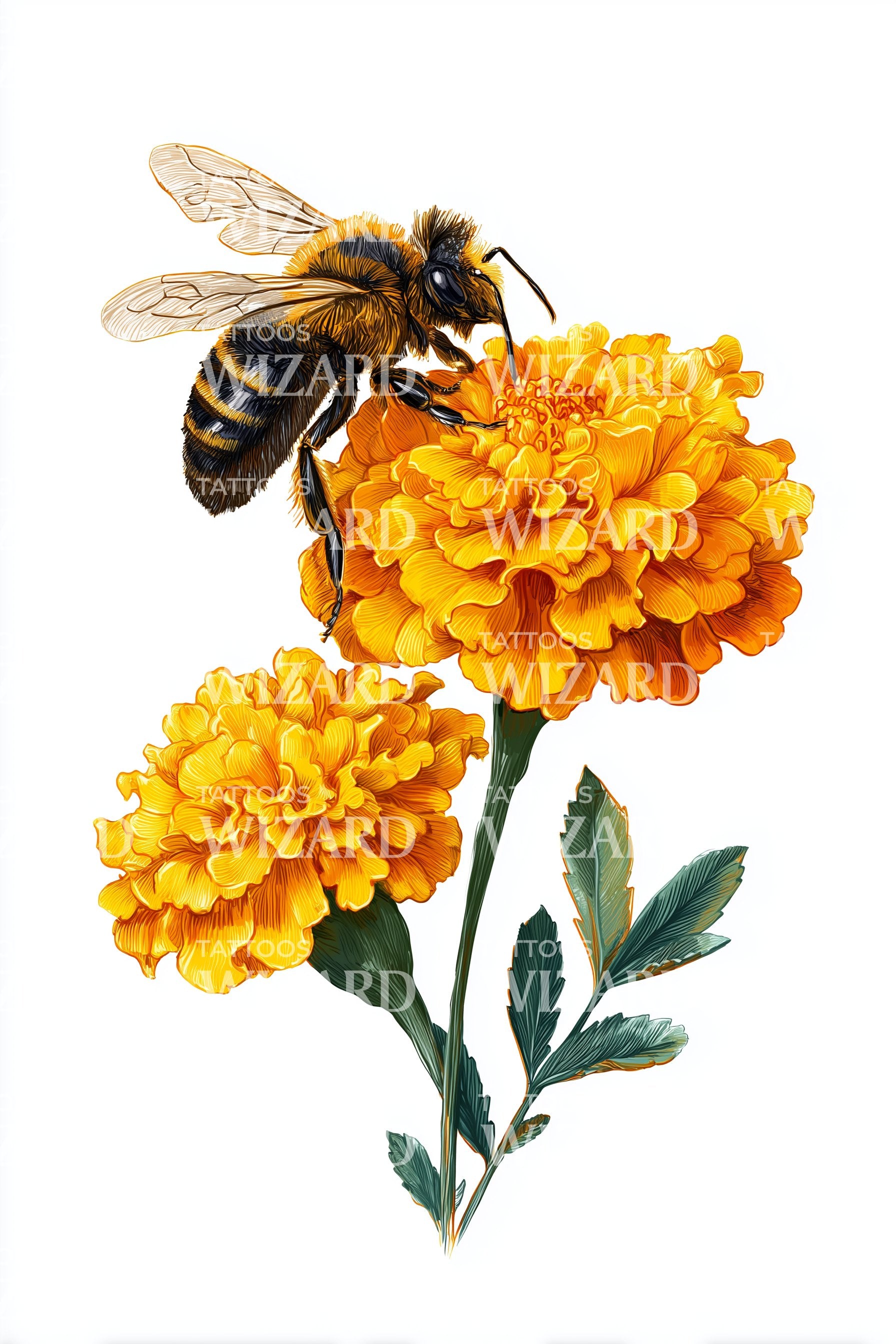 拥抱大自然的生机,这款令人惊叹的水彩蜜蜂与万寿菊纹身设计灵感源自授粉和色彩在生态系统中的重要作用,作品精美地展现了一只嗡嗡作响的蜜蜂,环绕着精致的万寿菊花朵。是独特花卉纹身爱好者的完美之选。